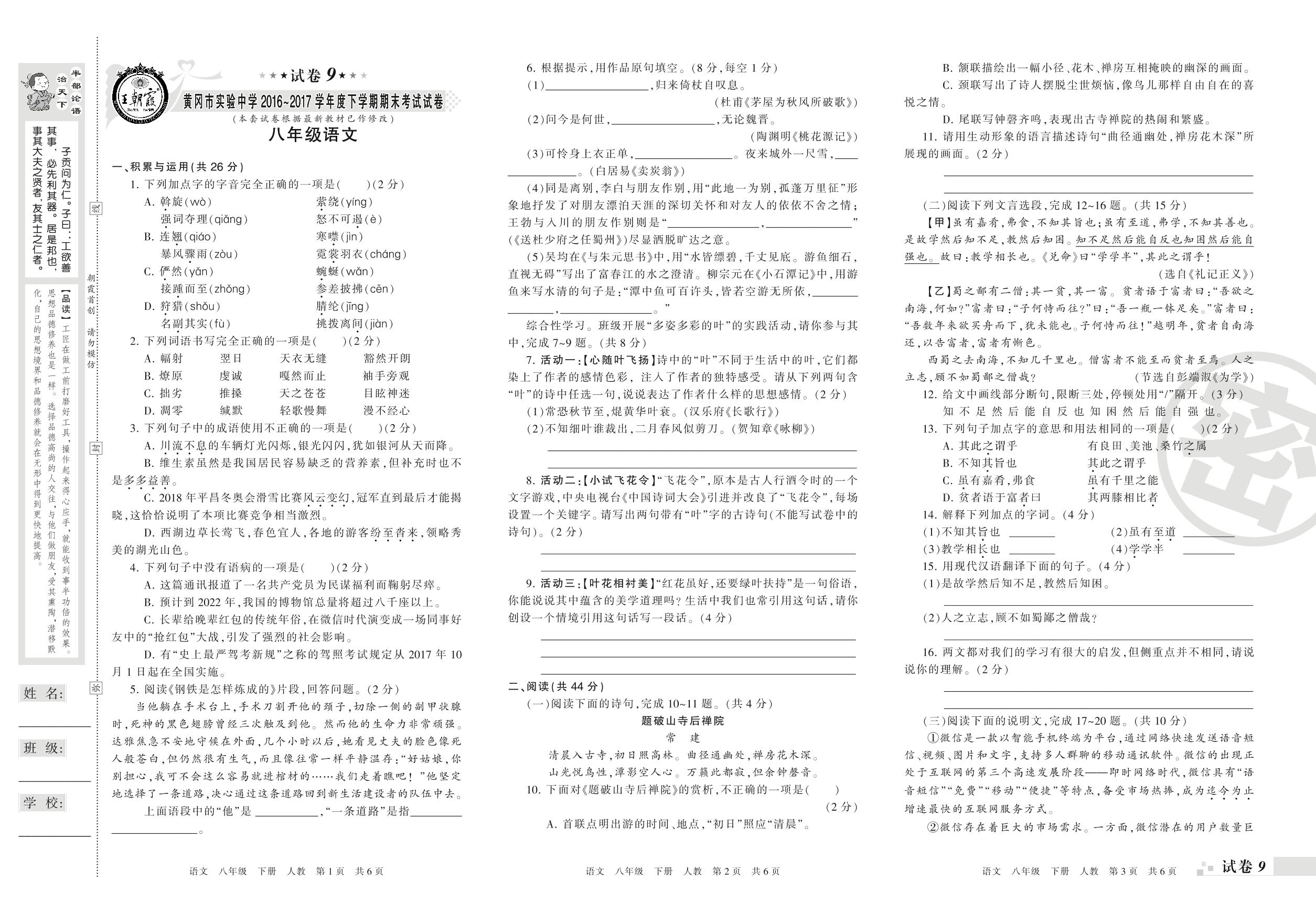 2016-2017学年第二学期黄冈市实验中学八年级语文试卷(人教版)【9】
