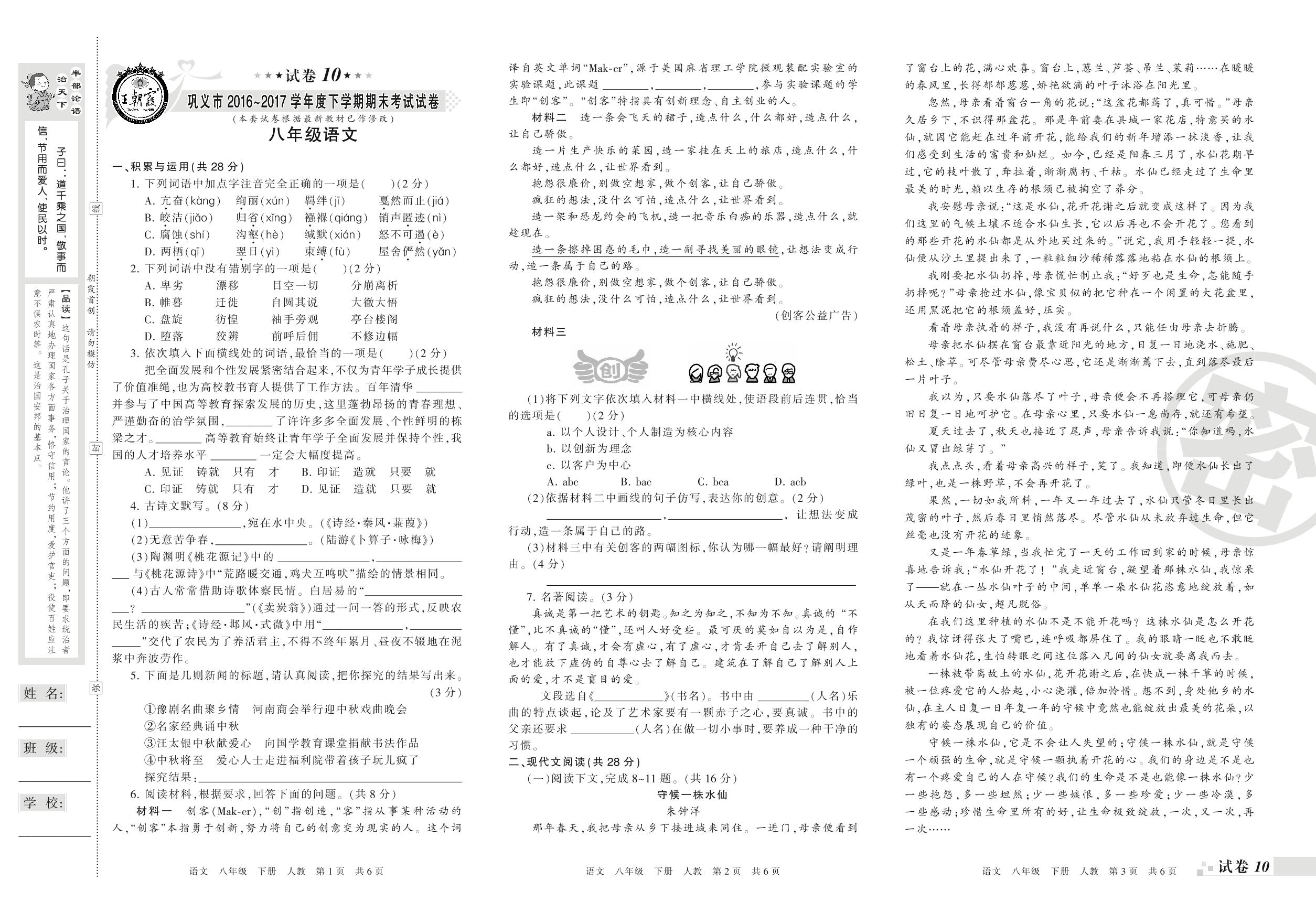 2016-2017学年第二学期巩义市八年级语文试卷(人教版)【10】