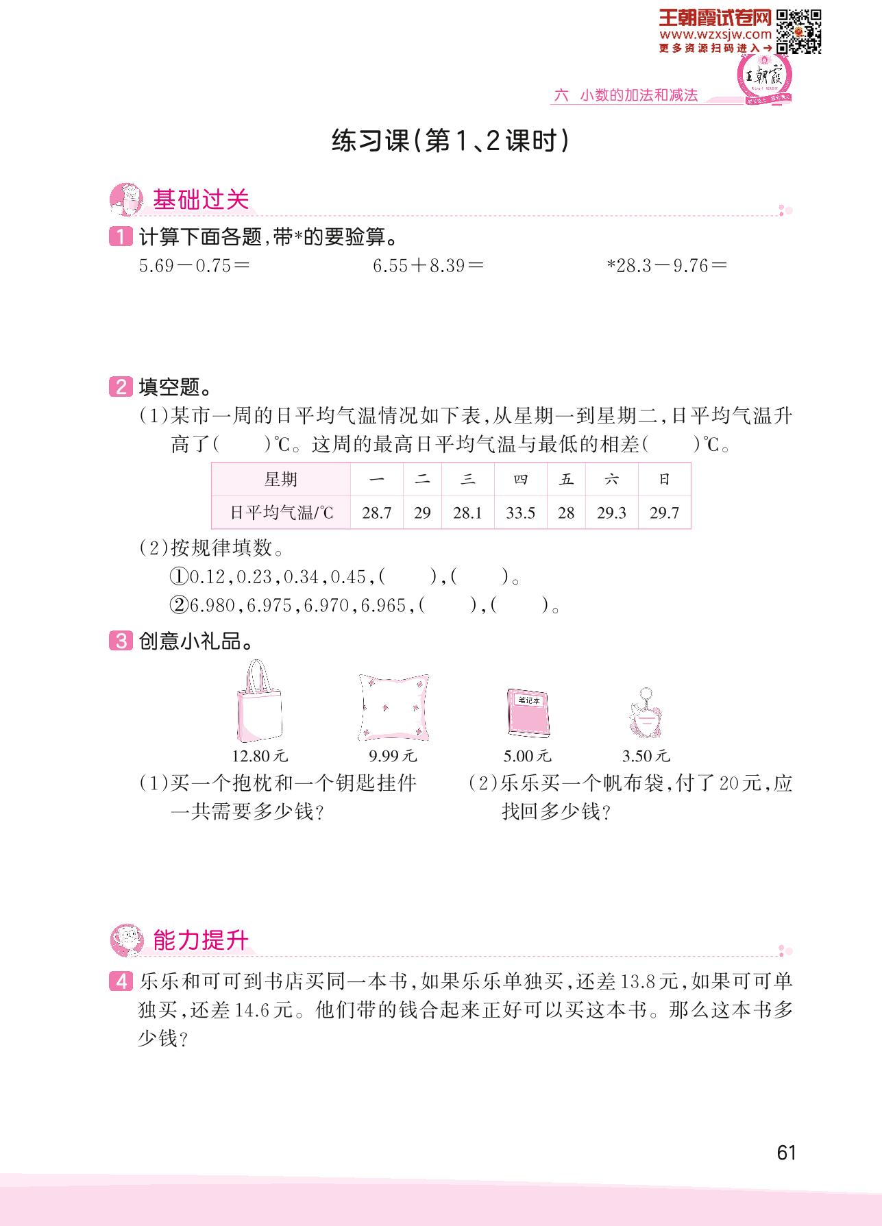 2023下册四年级数学人教版 六 小数的加法和减法——练习课(第1、2课时)