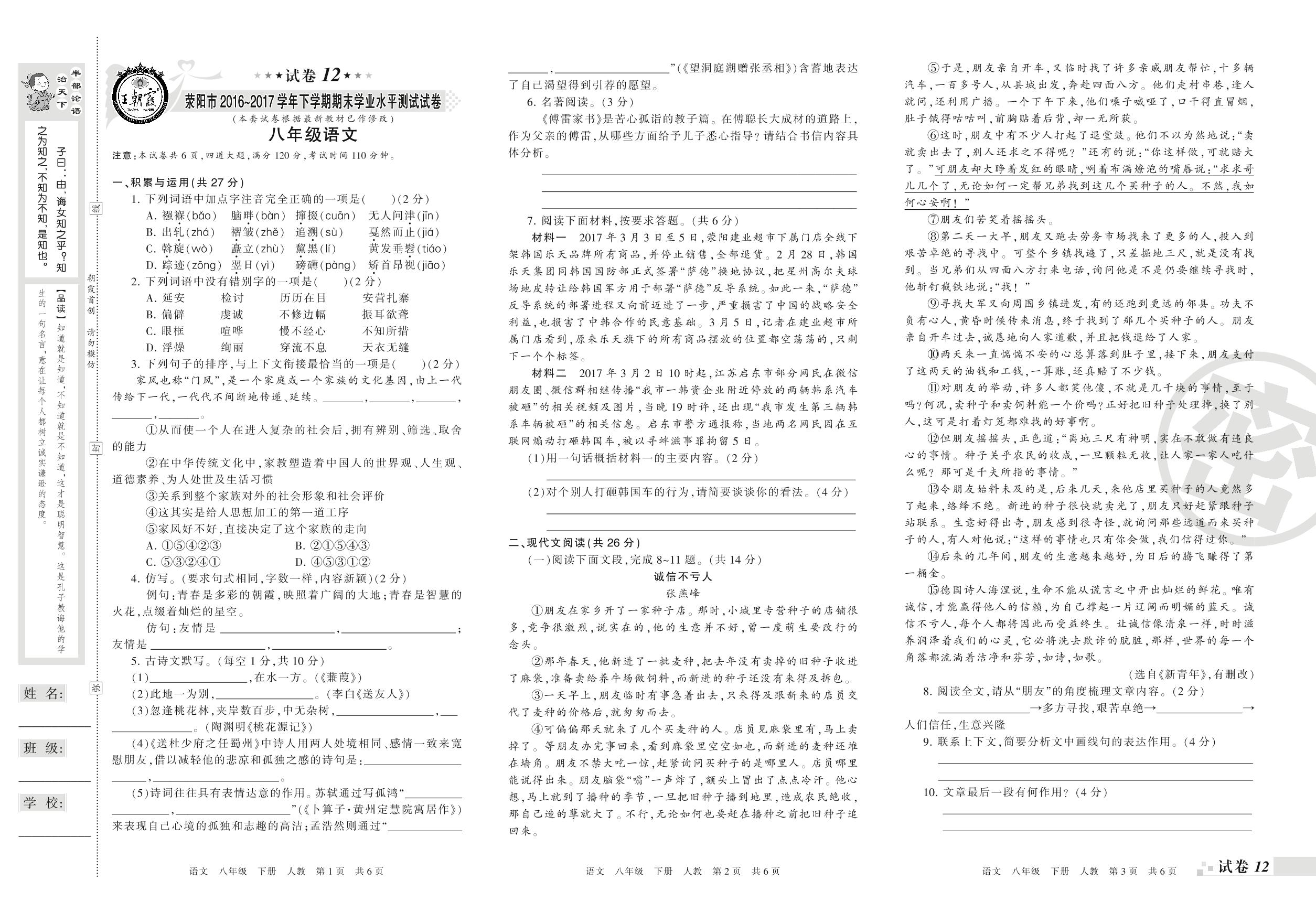 2016-2017学年第二学期荥阳市八年级语文试卷(人教版)【12】