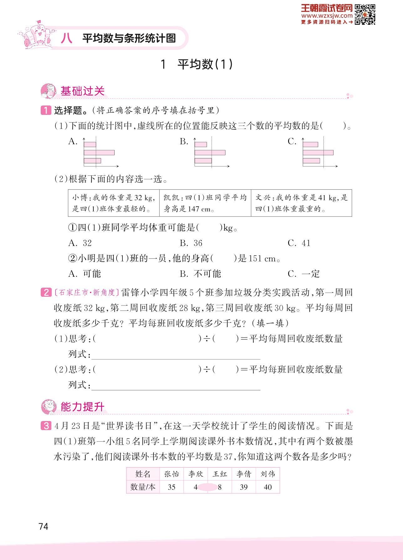 2023下册四年级数学人教版 八 平均数与条形统计图——1 平均数(1)