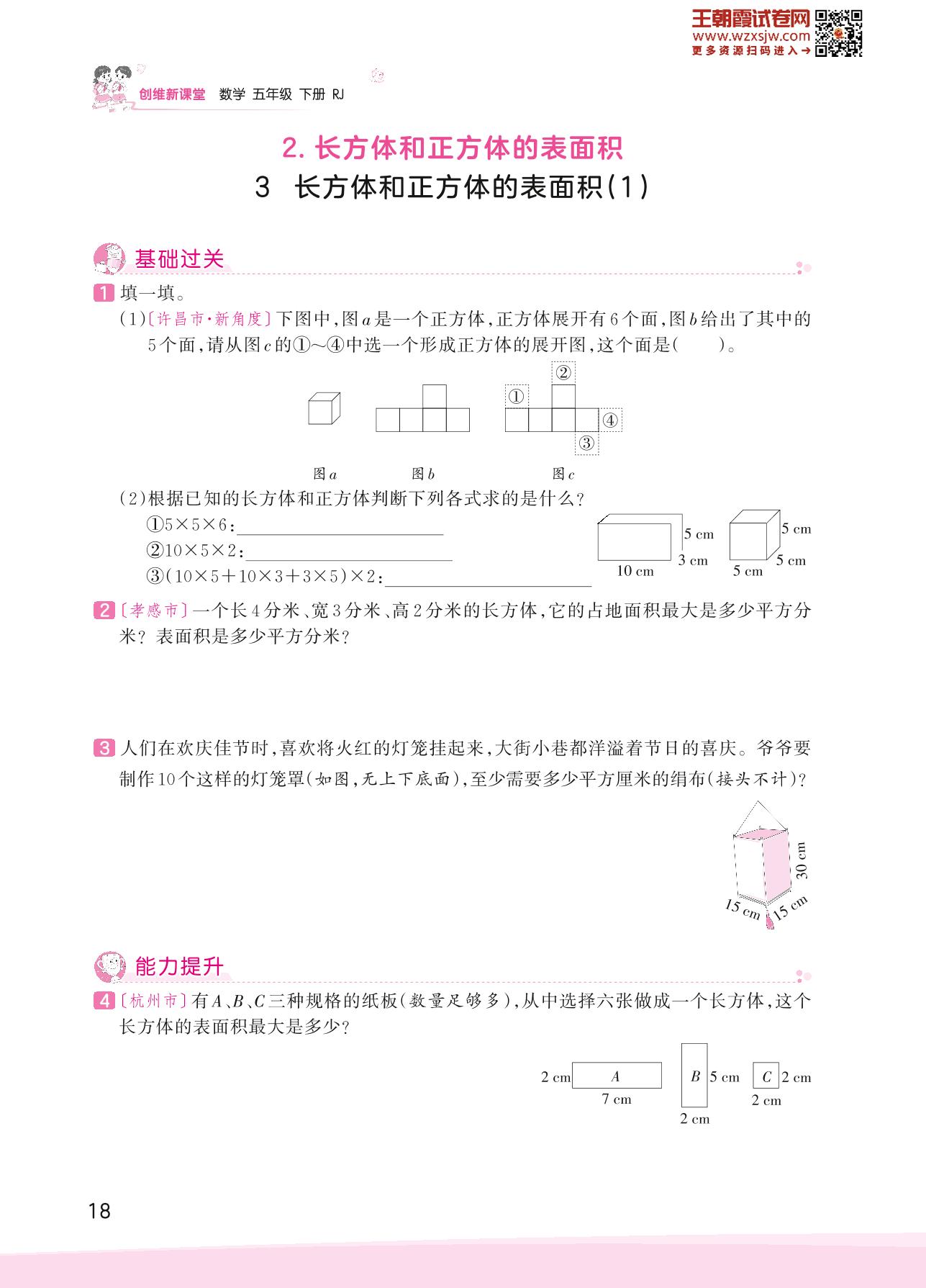 2023下册五年级数学人教版 三 长方体和正方体——3 长方体和正方体的表面积(1)