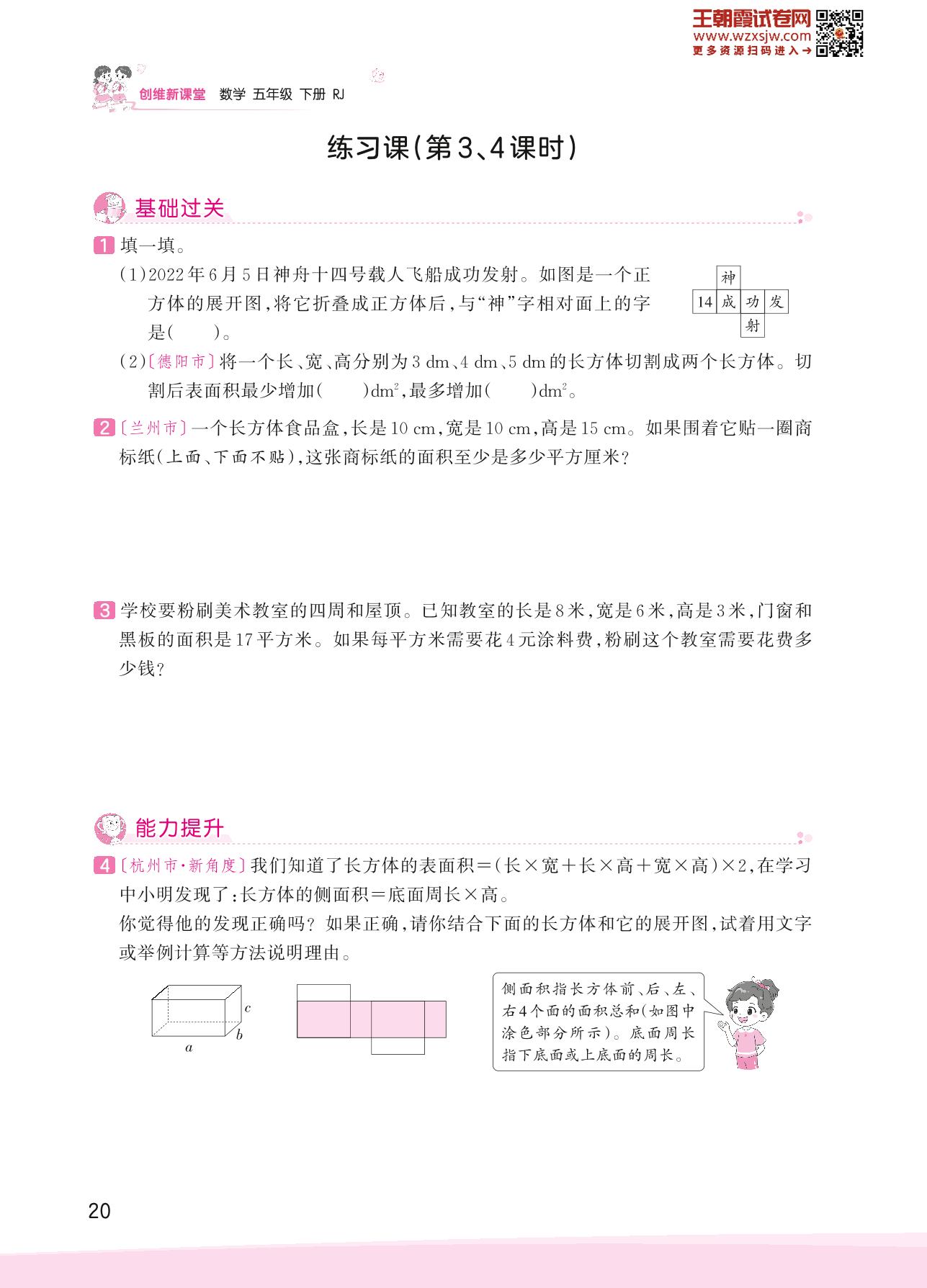 2023下册五年级数学人教版 三 长方体和正方体——练习课(第3、4课时)
