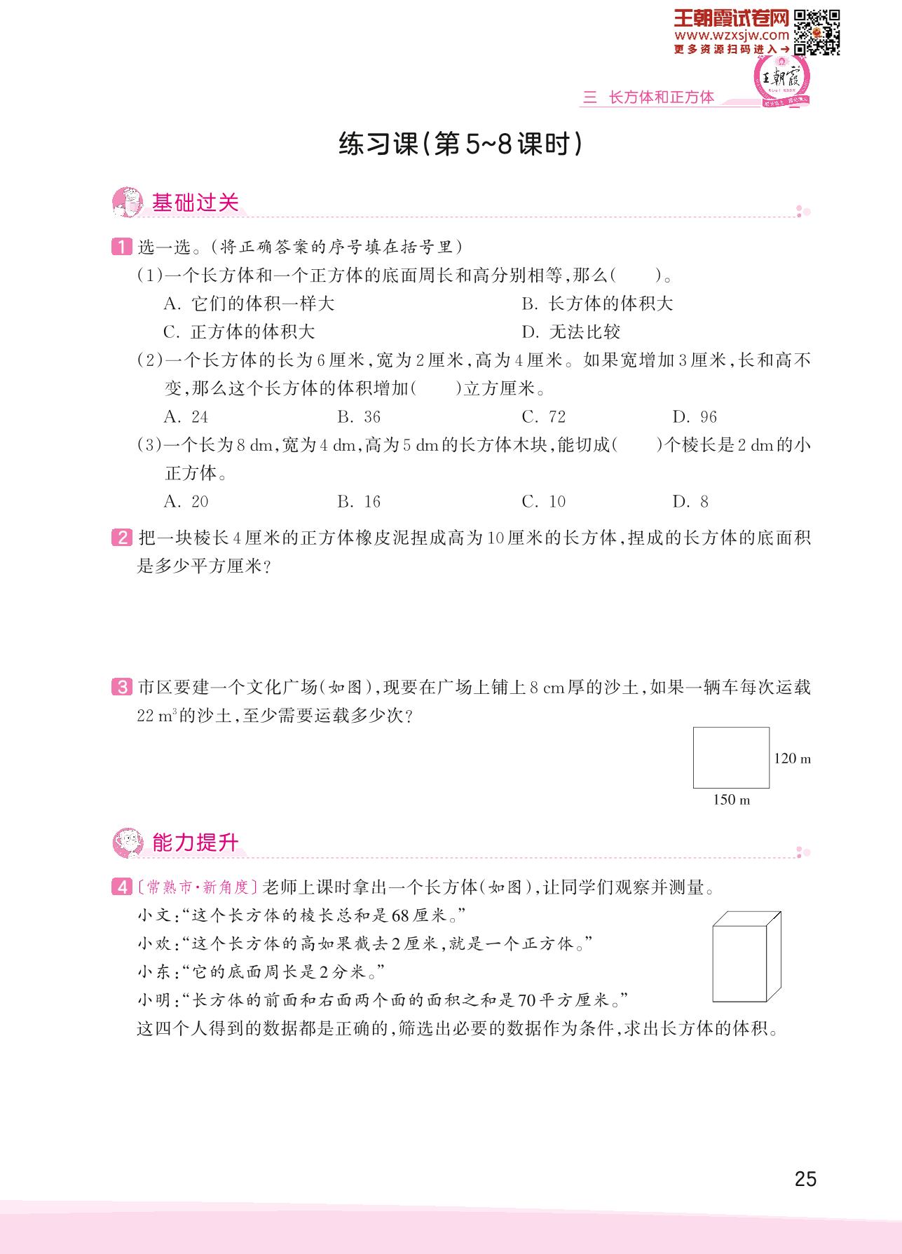 2023下册五年级数学人教版 三 长方体和正方体——练习课(第5~8课时)