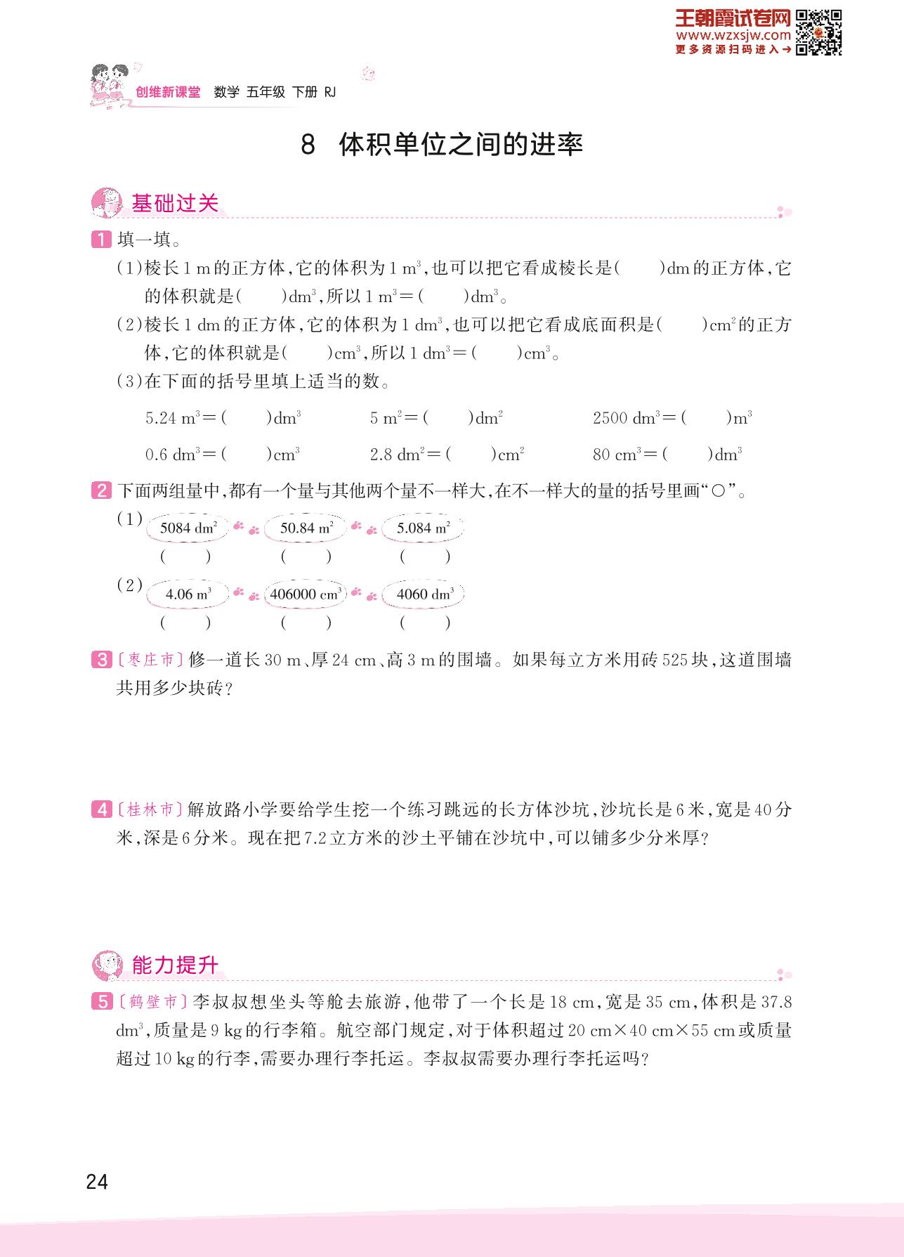 2023下册五年级数学人教版 三 长方体和正方体——8 体积单位之间的进率