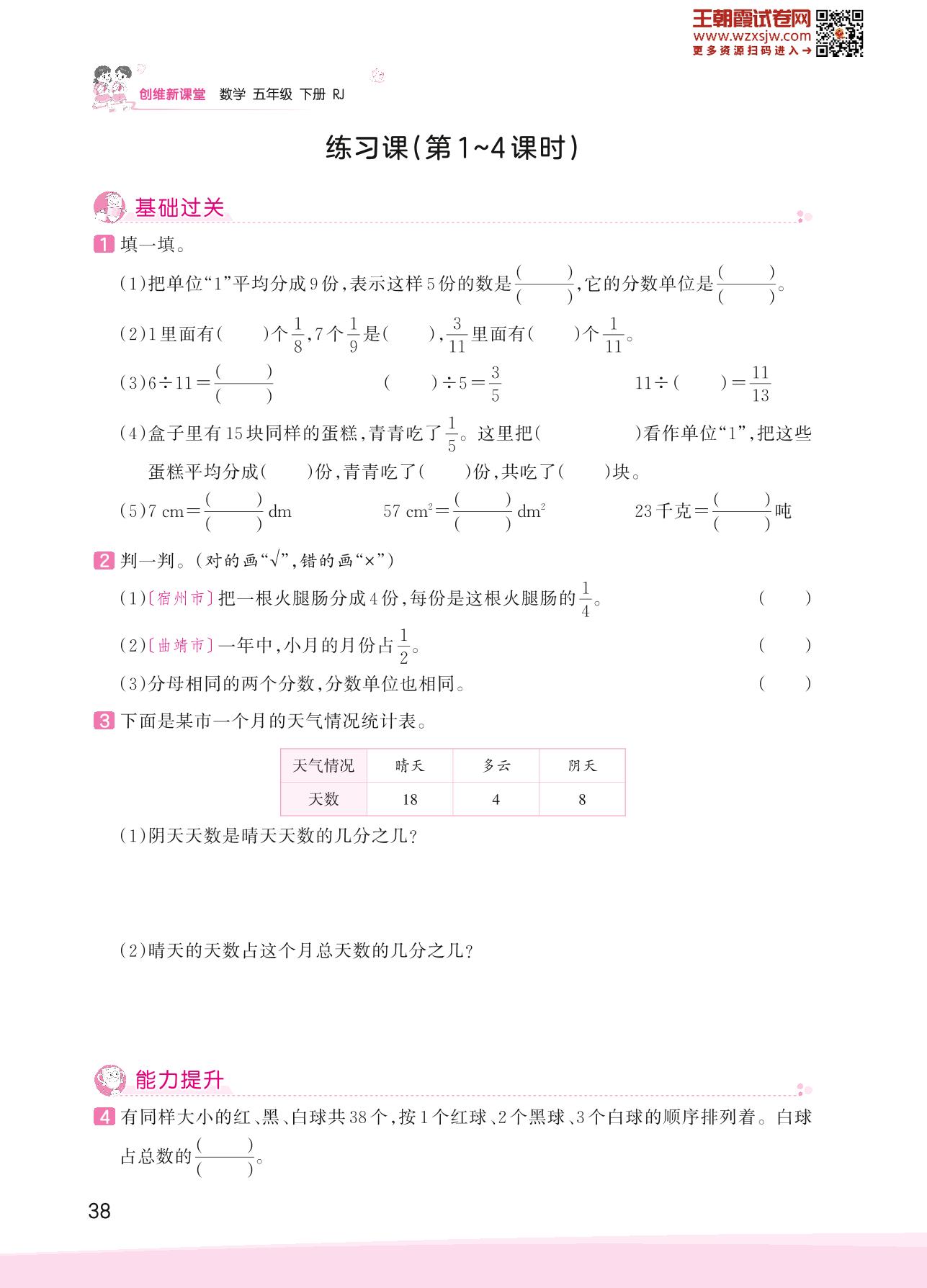 2023下册五年级数学人教版 四 分数的意义和性质——练习课(第1~4课时)