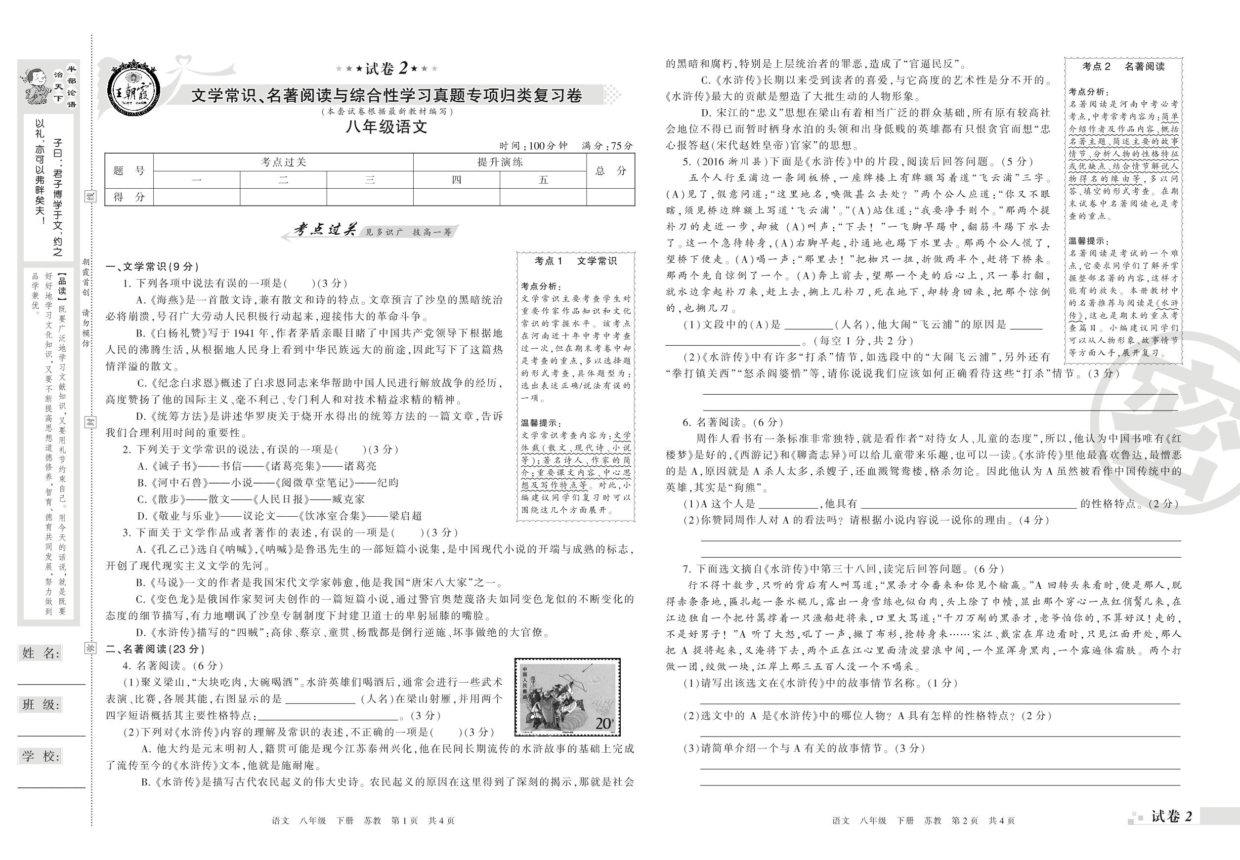 王朝霞期末专项卷——文学常识、名著阅读与综合性学习真题专项归类复习卷八年级下册语文(苏教版)_R210802184313【2】