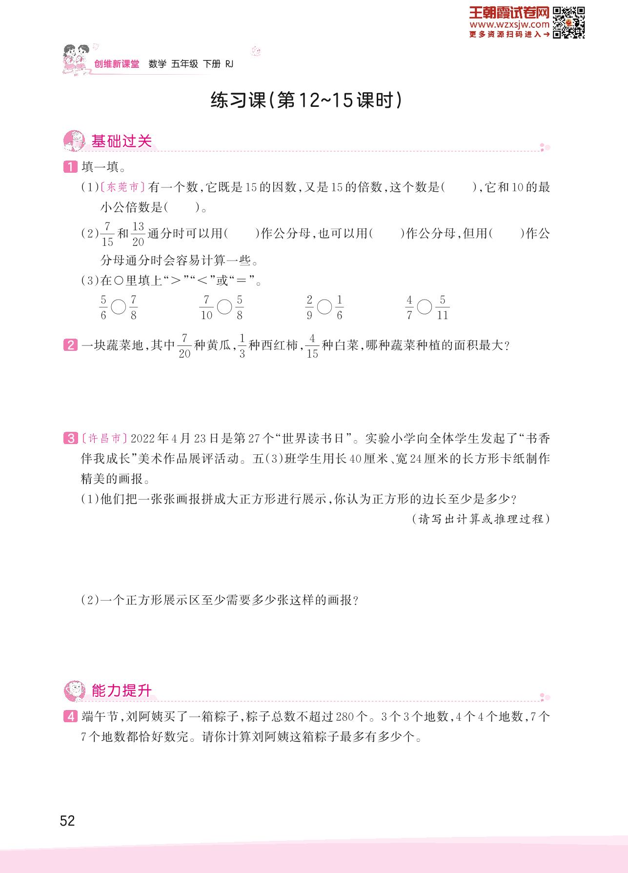 2023下册五年级数学人教版 四 分数的意义和性质——练习课(第12~15课时)