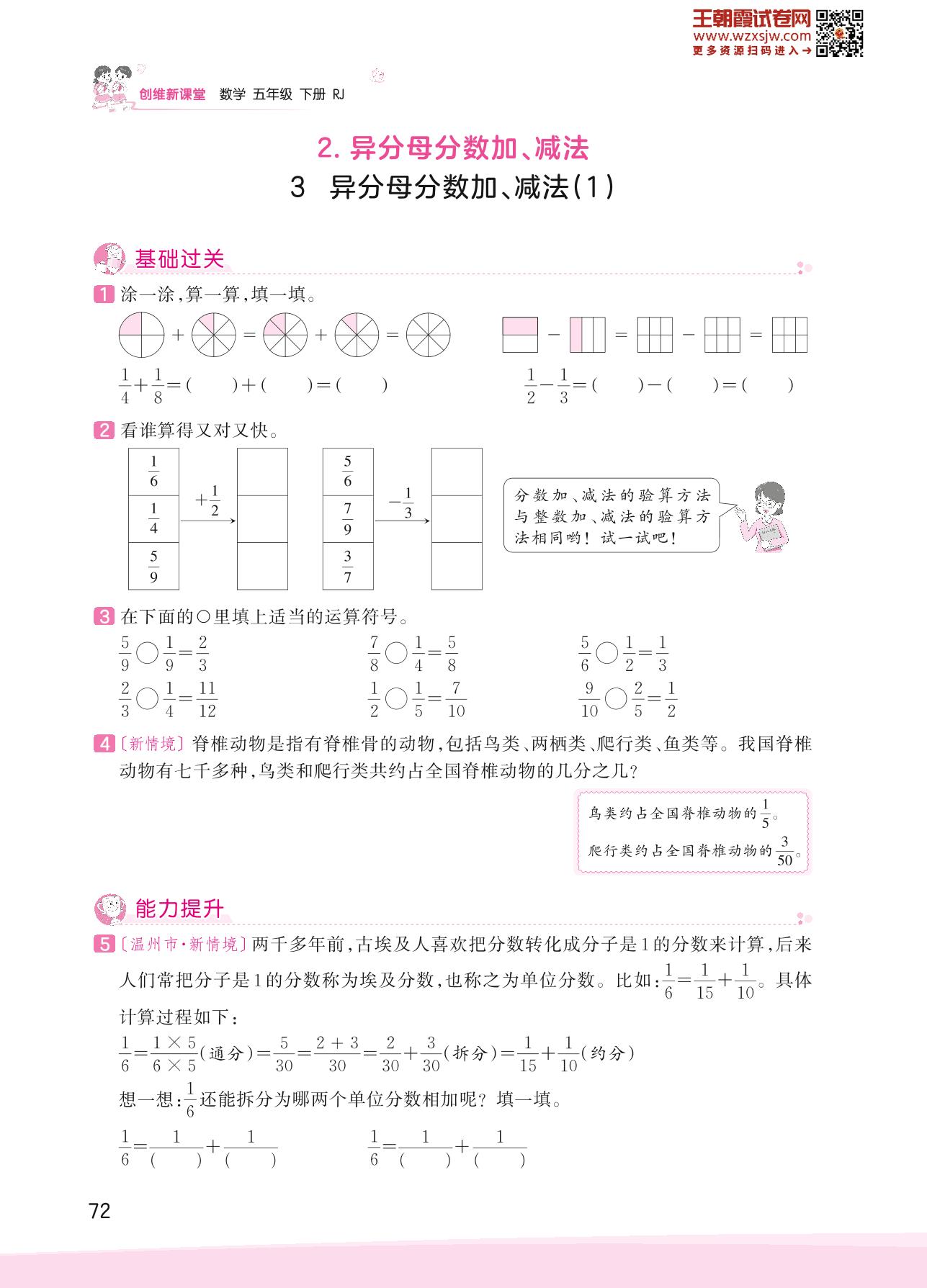 2023下册五年级数学人教版 六 分数的加法和减法——3 异分母分数加、减法(1)