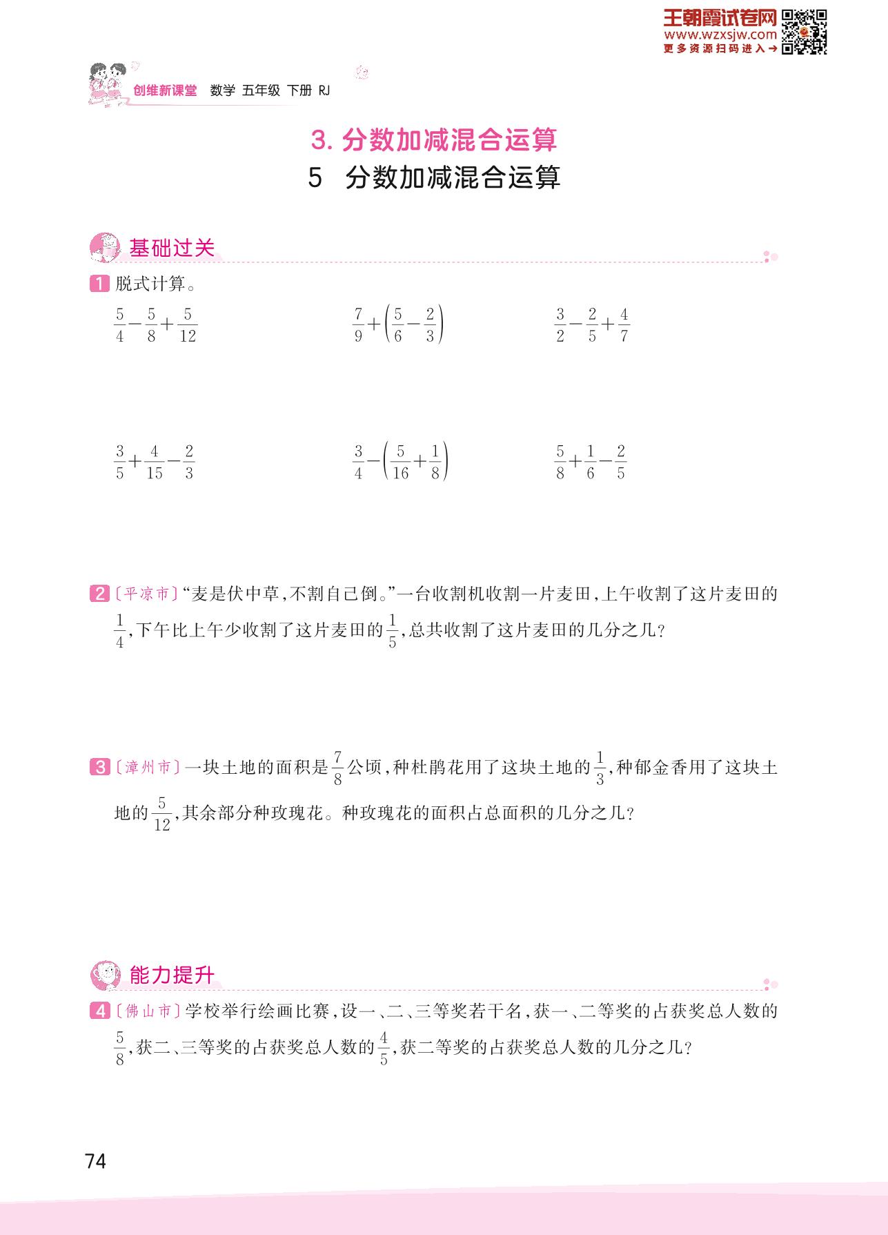 2023下册五年级数学人教版 六 分数的加法和减法——5 分数加减混合运算