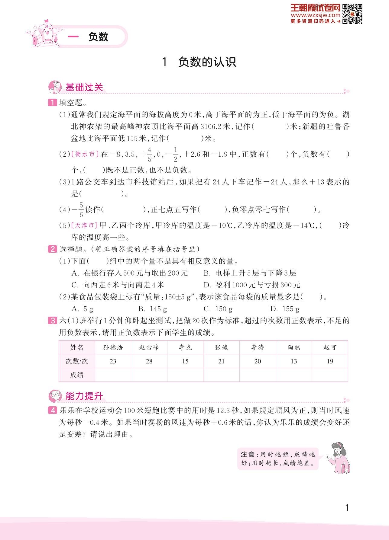 2023下册六年级数学人教版 一 负数——1 负数的认识