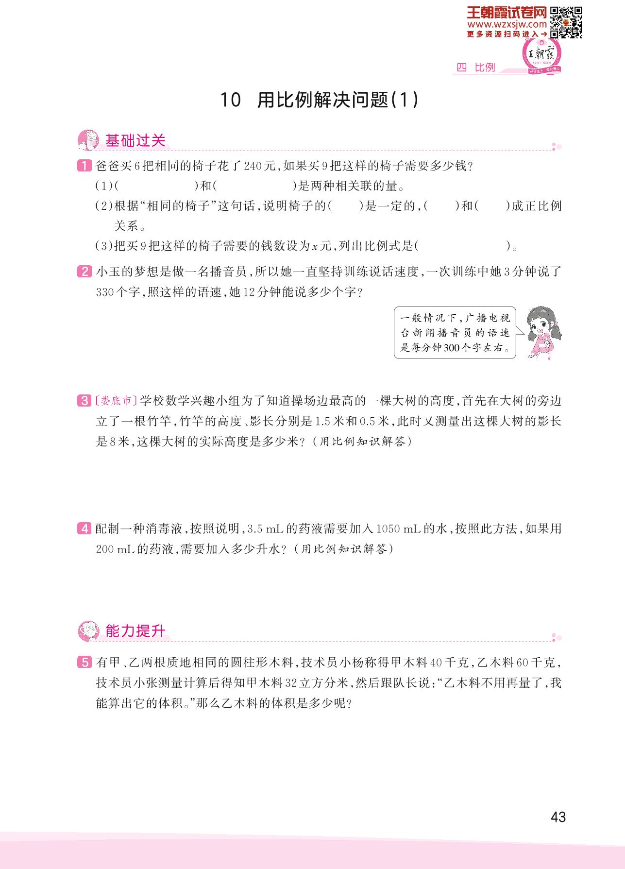 2023下册六年级数学人教版 四 比例——10 用比例解决问题(1)