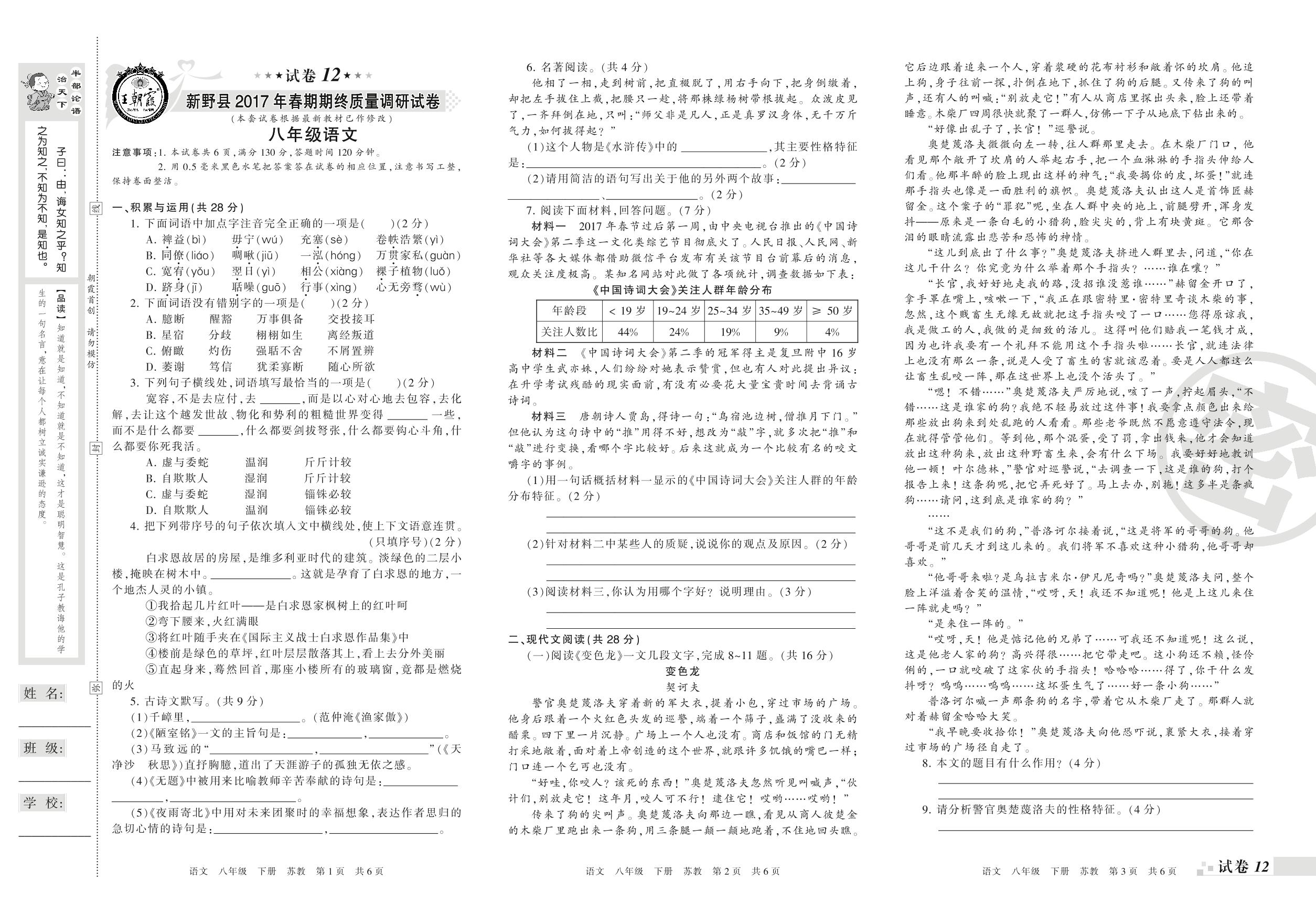 2016-2017学年第二学期南阳市新野县八年级语文试卷(苏教版)【12】