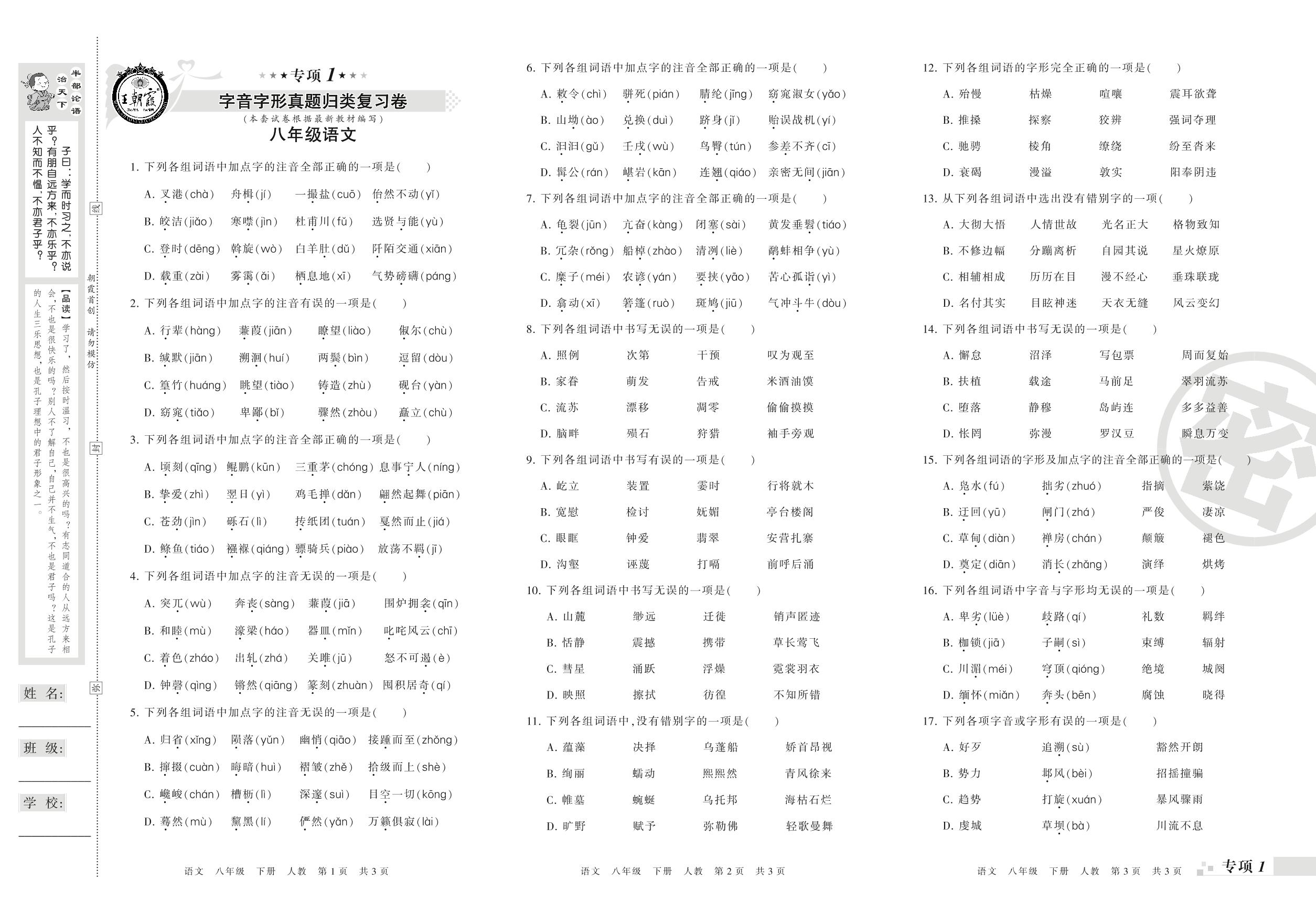 王朝霞期末专项卷——字音字形真题归类复习卷八年级下册语文(人教版)_R210802184535【0】