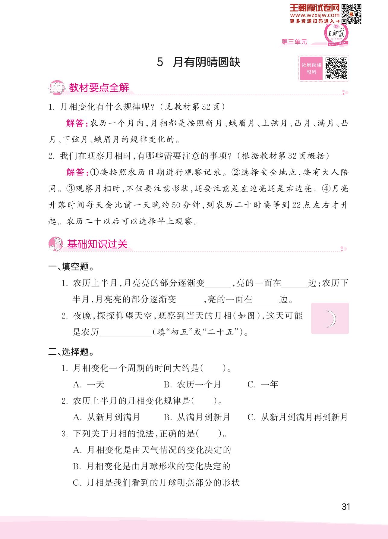 2023下册四年级科学大象版 第三单元 太阳、地球和月球——5 月有阴晴圆缺