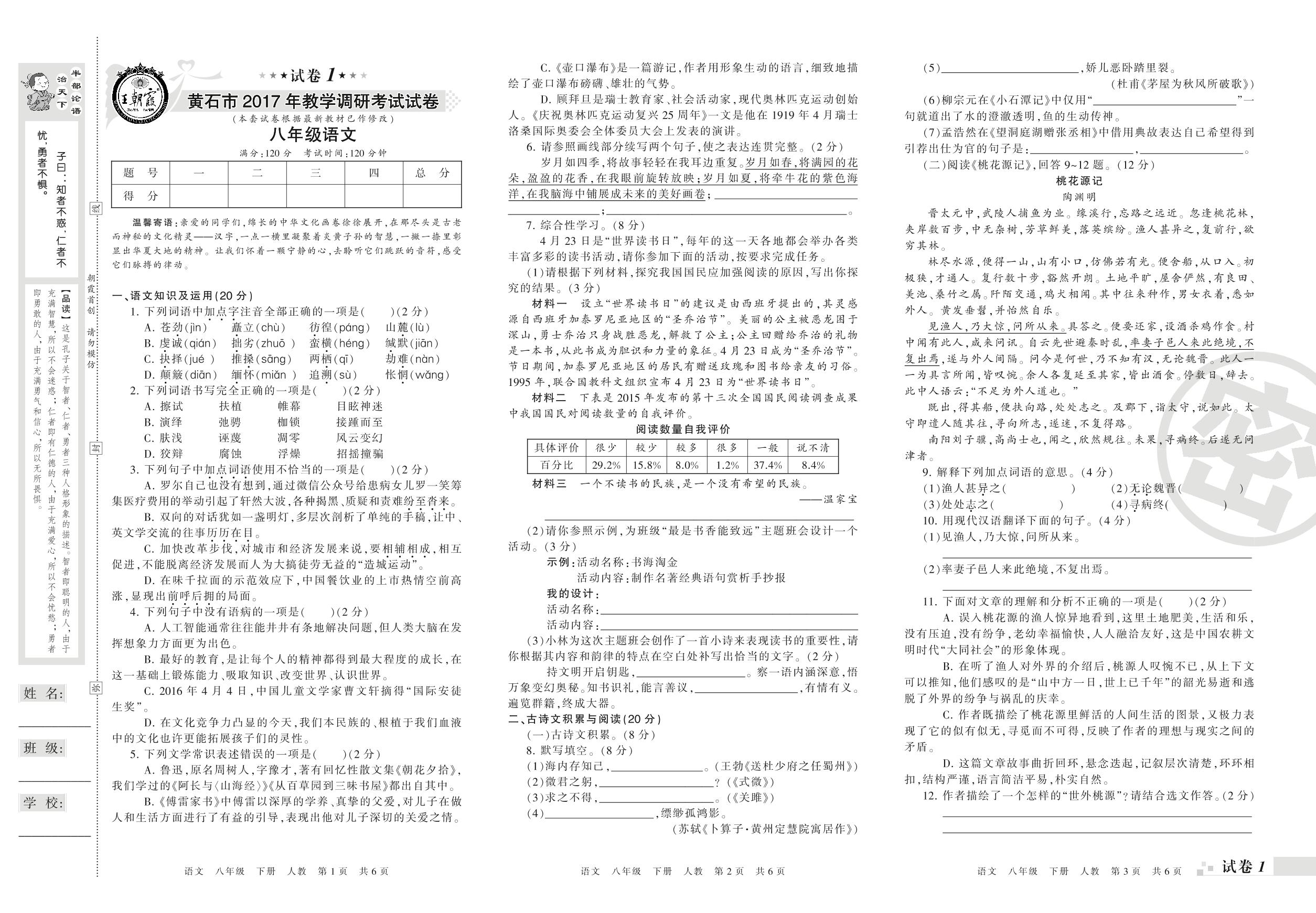 2016-2017学年第二学期黄石市八年级语文试卷(人教版)【1】