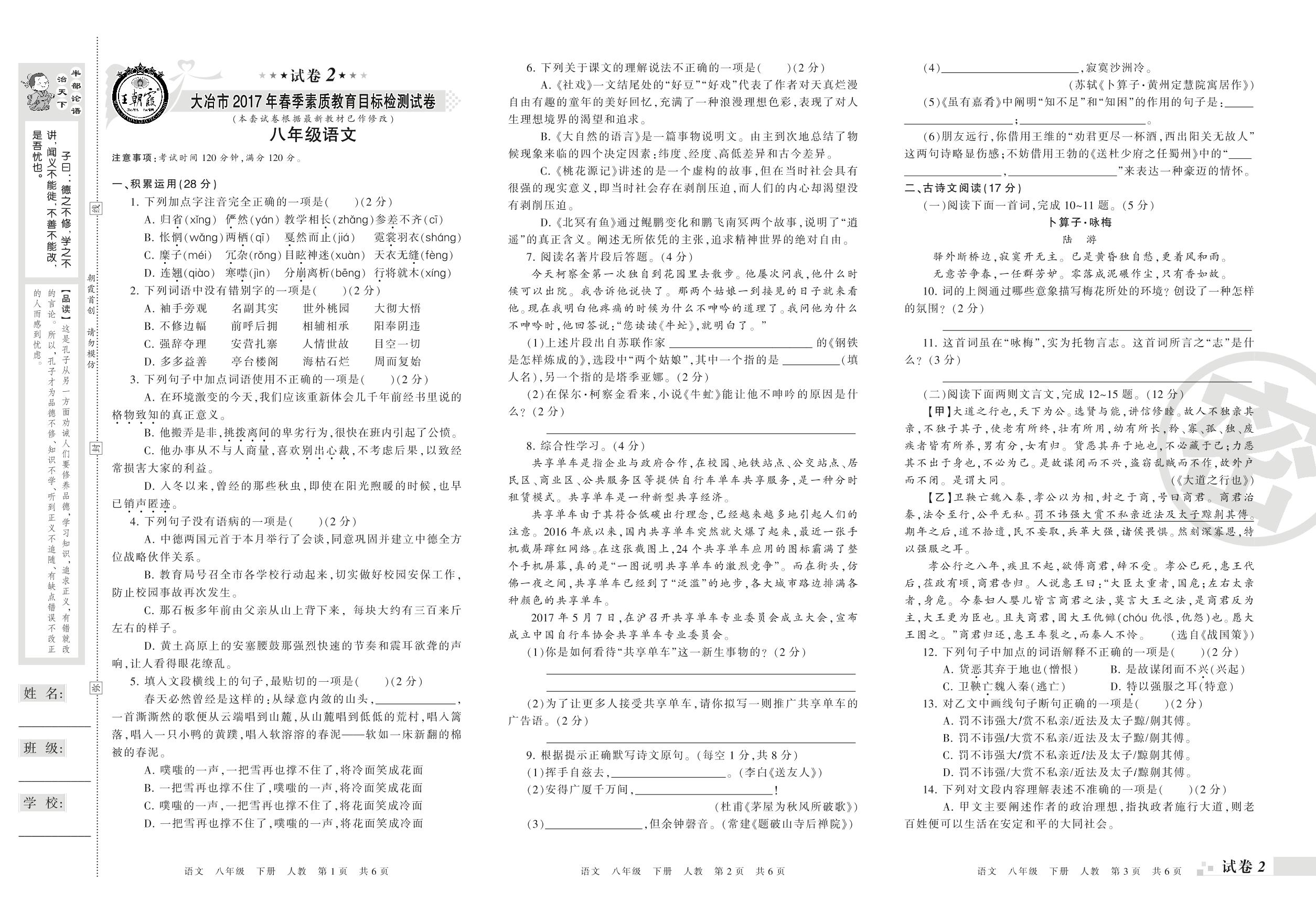 2016-2017学年第二学期大冶市八年级语文试卷(人教版)【2】
