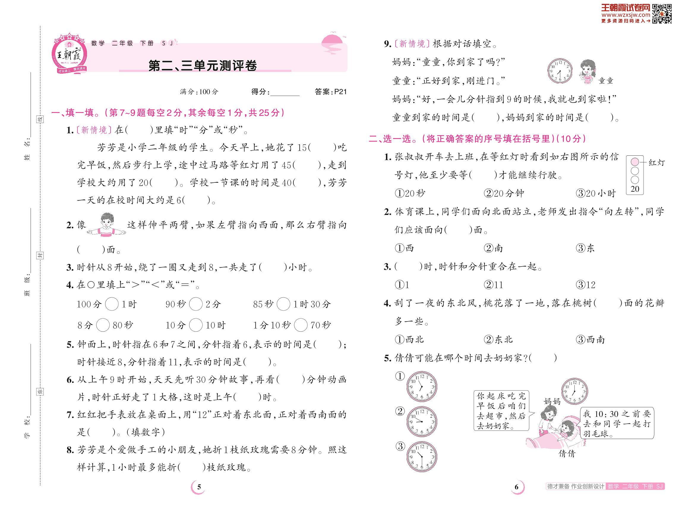 2023下册二年级数学苏教版 第二、三单元测评卷