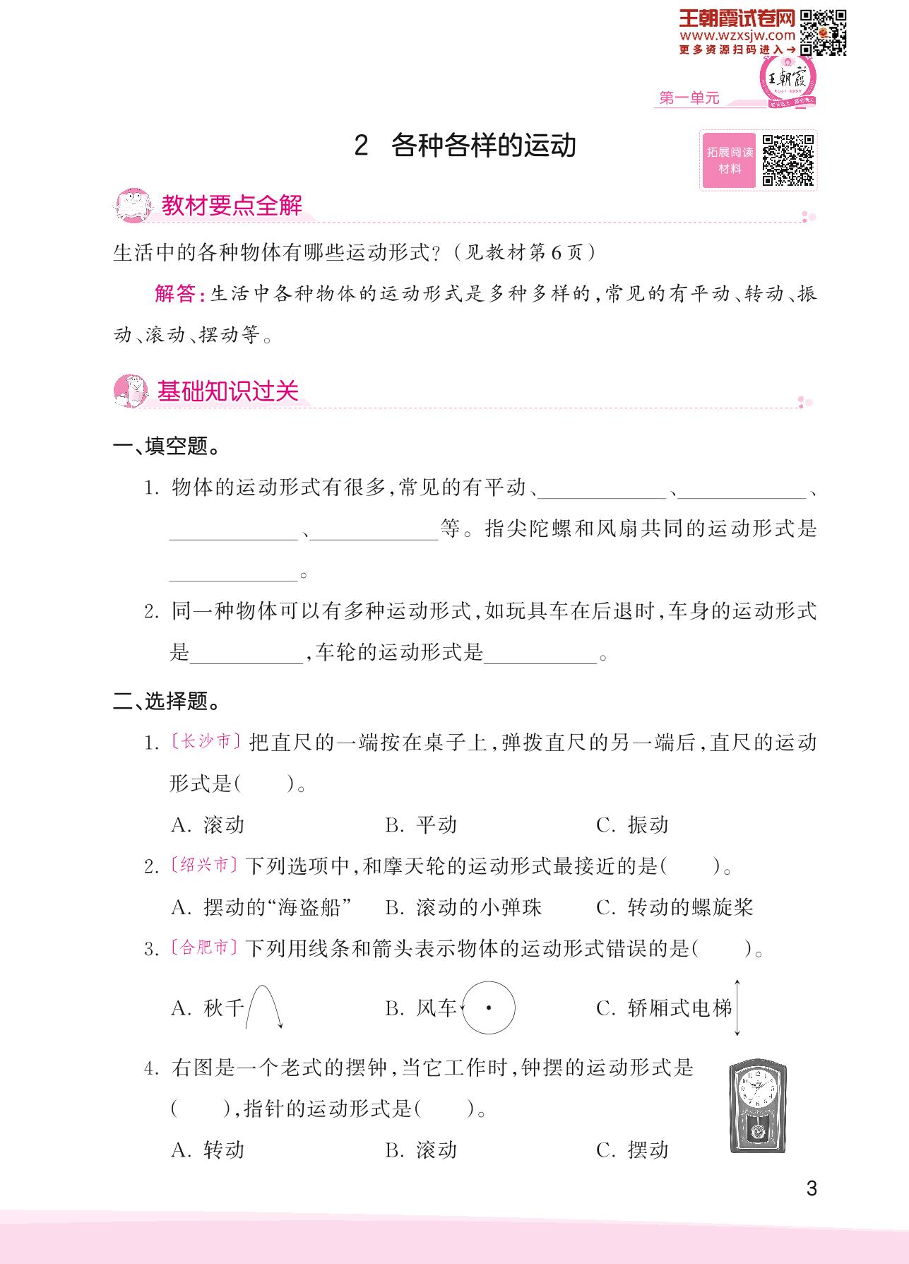 2023下册三年级科学教科版 第一单元 物体的运动——2 各种各样的运动