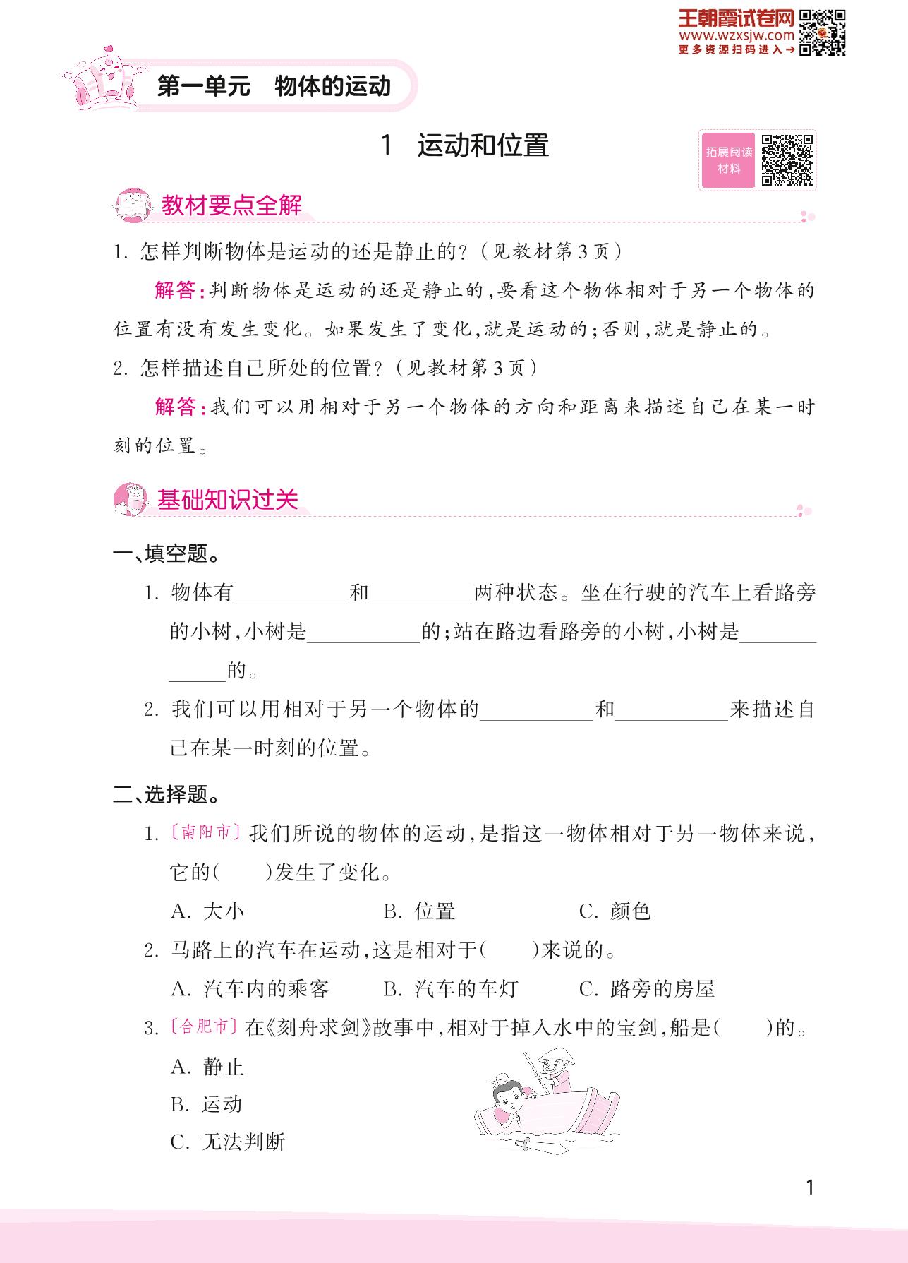 2023下册三年级科学教科版 第一单元 物体的运动——1 运动和位置