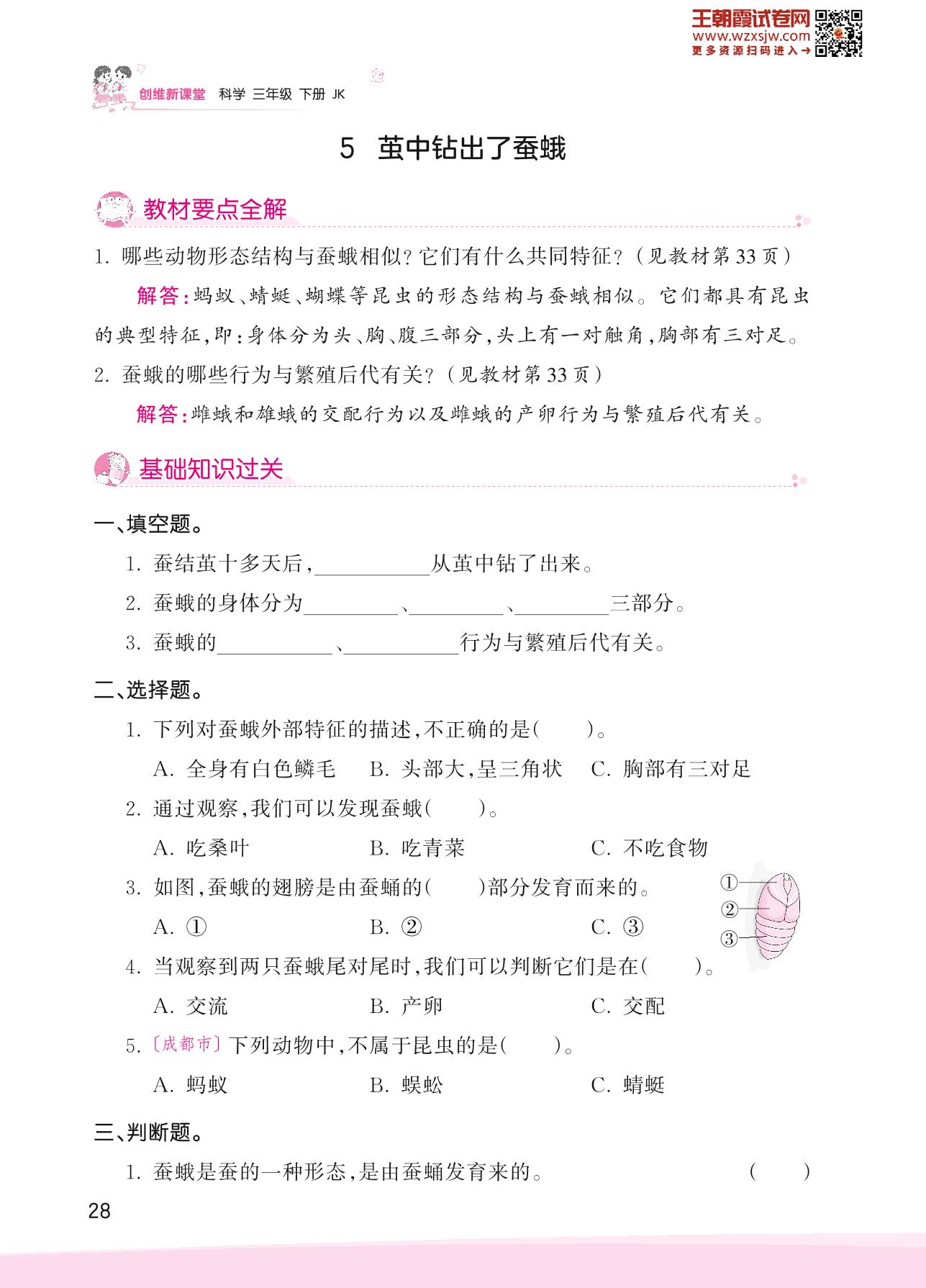 2023下册三年级科学教科版 第二单元 动物的一生——5 茧中钻出了蚕蛾