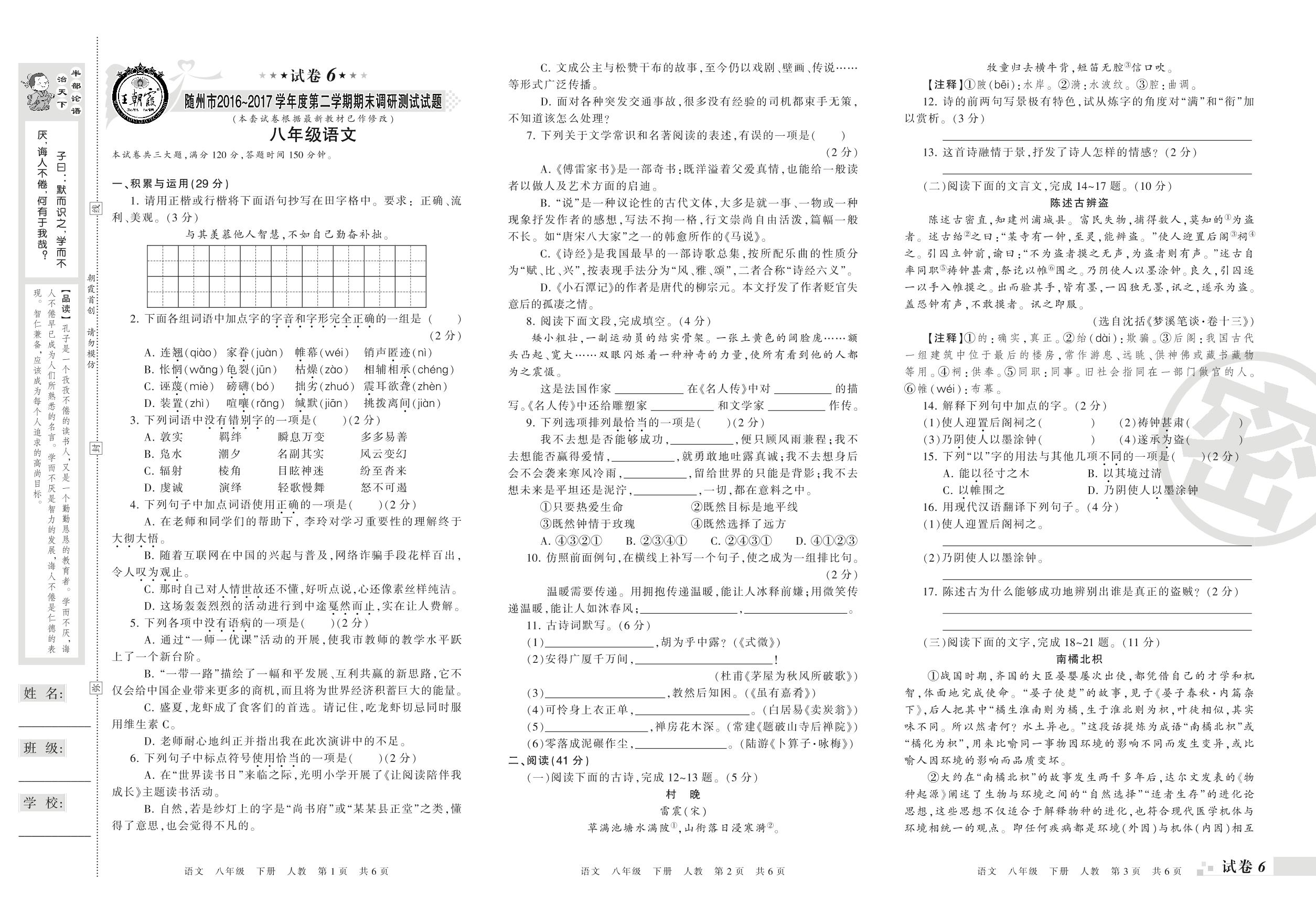 2016-2017学年第二学期随州市八年级语文试卷(人教版)【6】