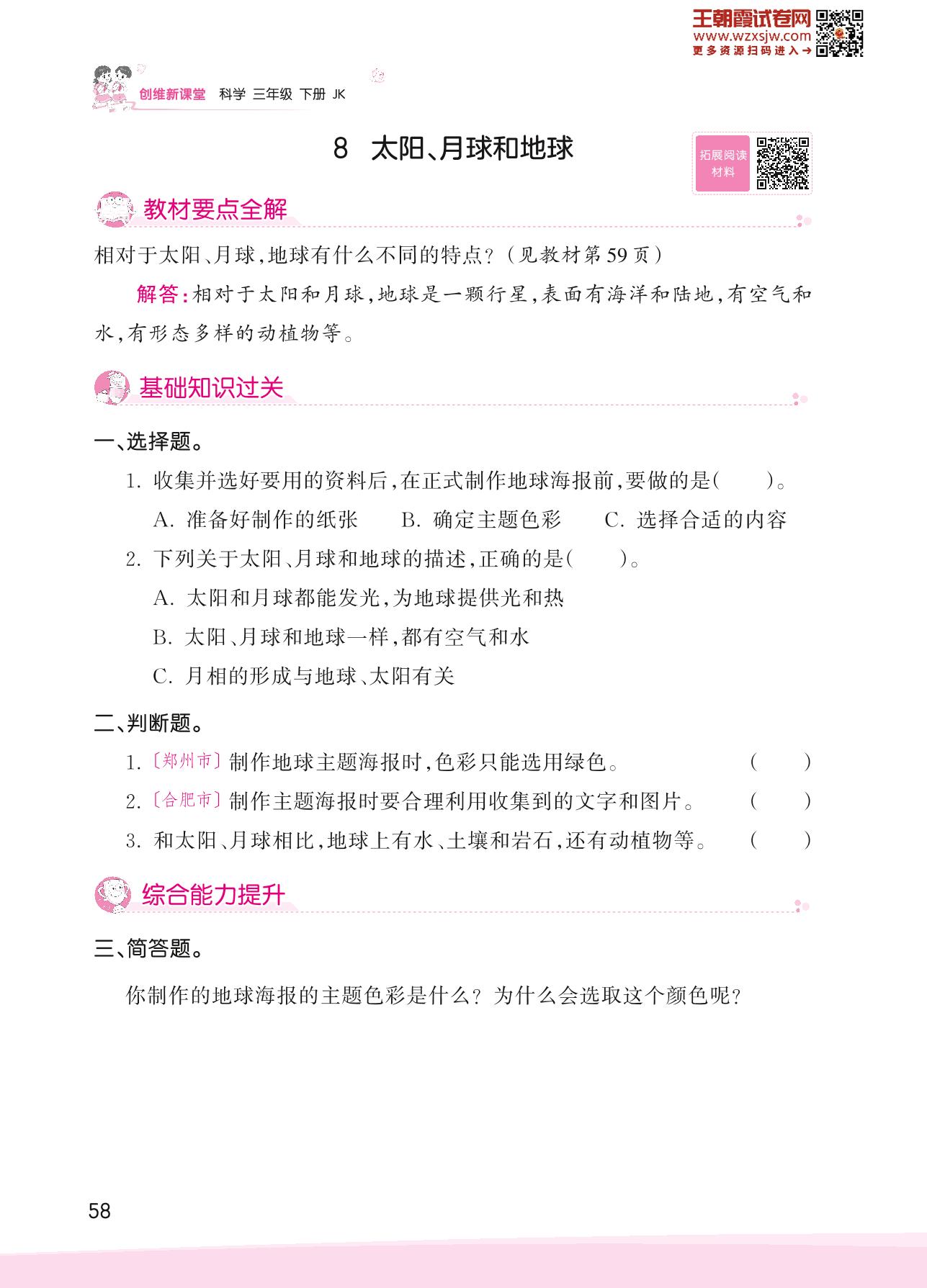 2023下册三年级科学教科版 第三单元 太阳、地球和月球——8 太阳、月球和地球