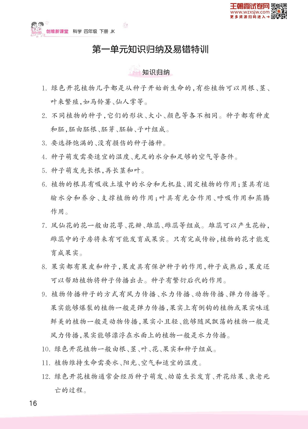 2023下册四年级科学教科版 第一单元知识归纳及易错特训