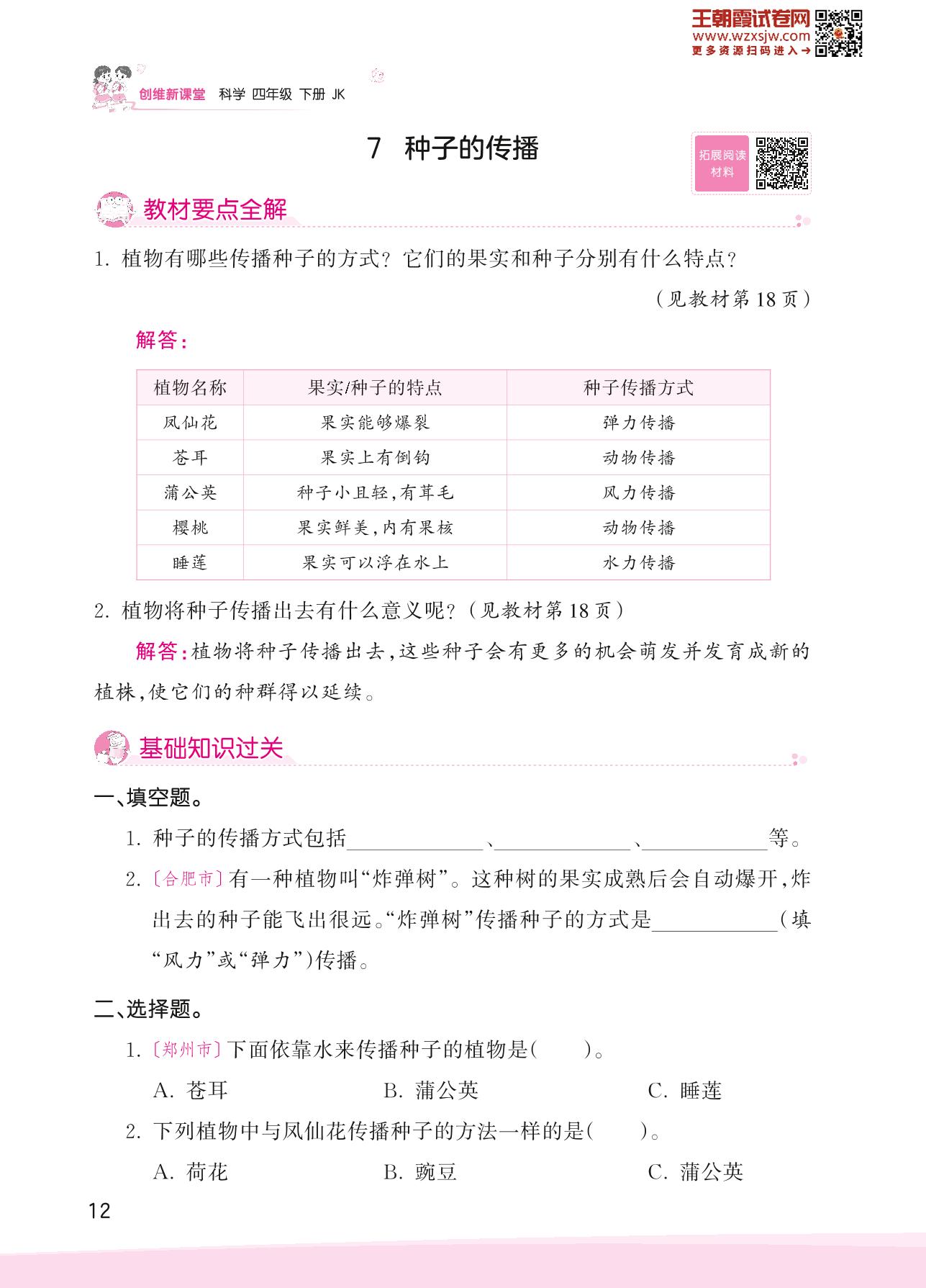 2023下册四年级科学教科版 第一单元 植物的生长变化——7 种子的传播