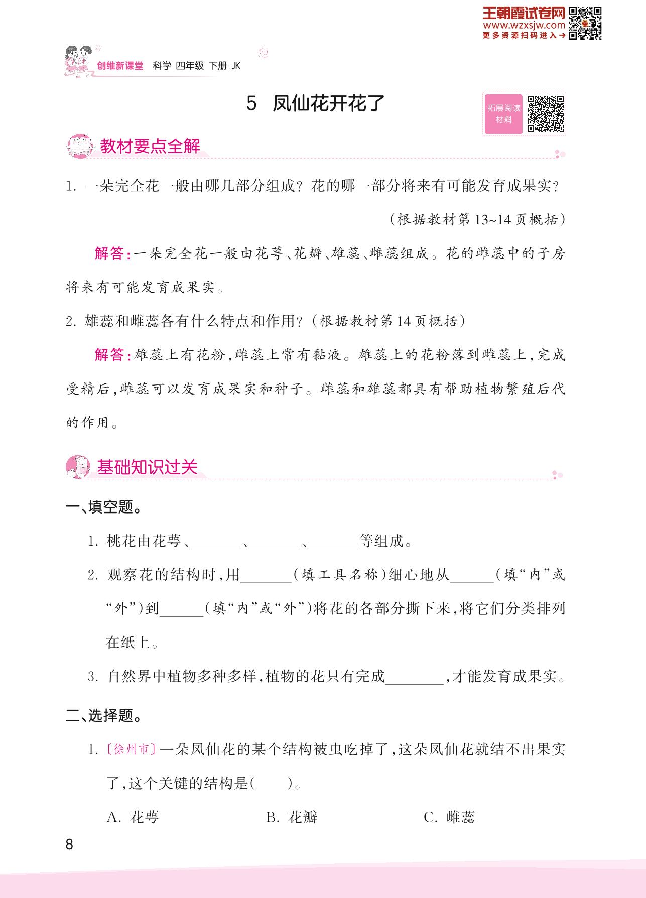 2023下册四年级科学教科版 第一单元 植物的生长变化——5 凤仙花开花了