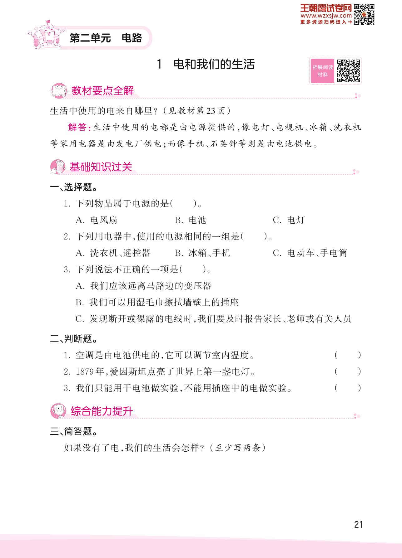 2023下册四年级科学教科版 第二单元 电路——1 电和我们的生活