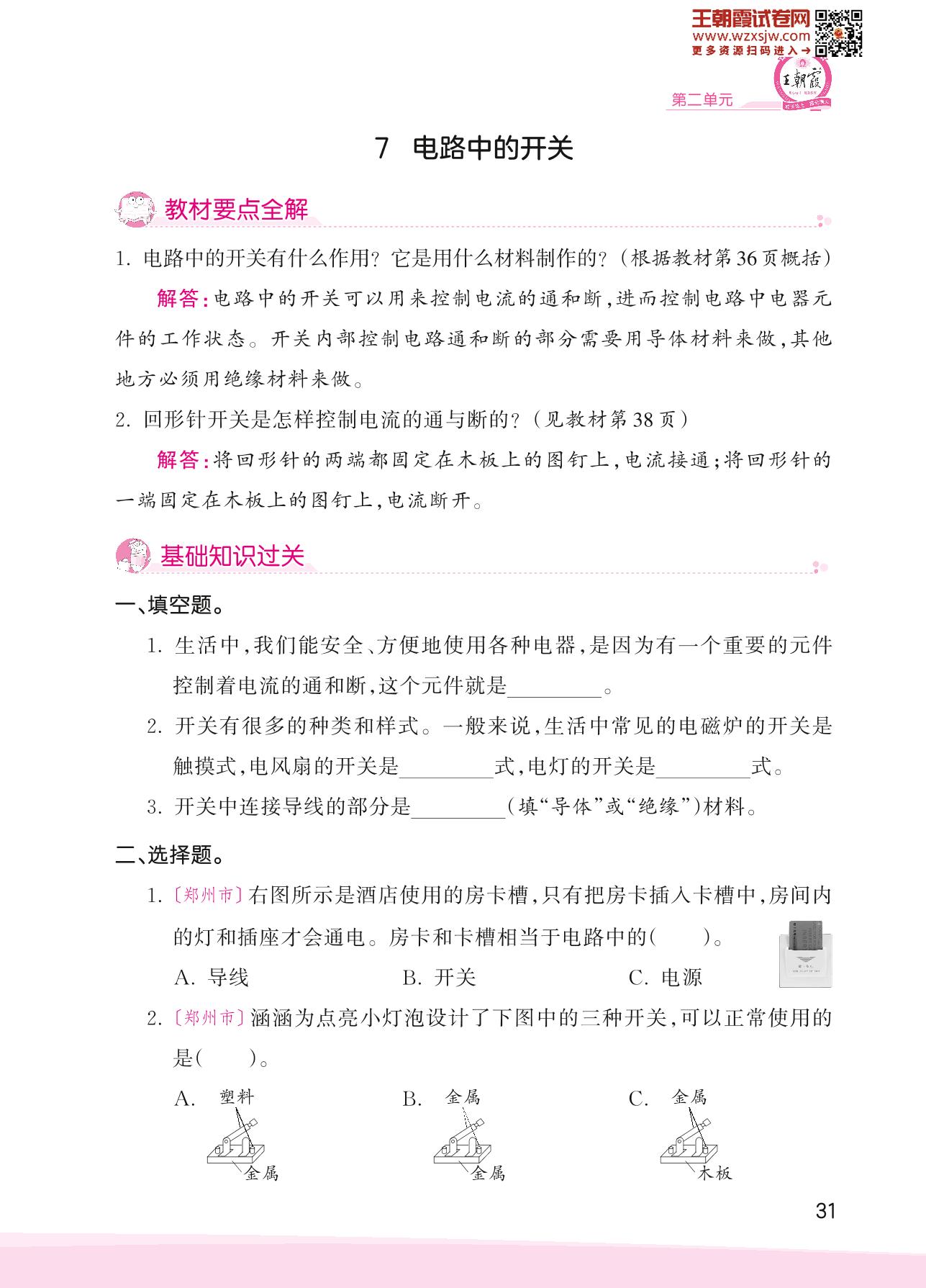 2023下册四年级科学教科版 第二单元 电路——7 电路中的开关