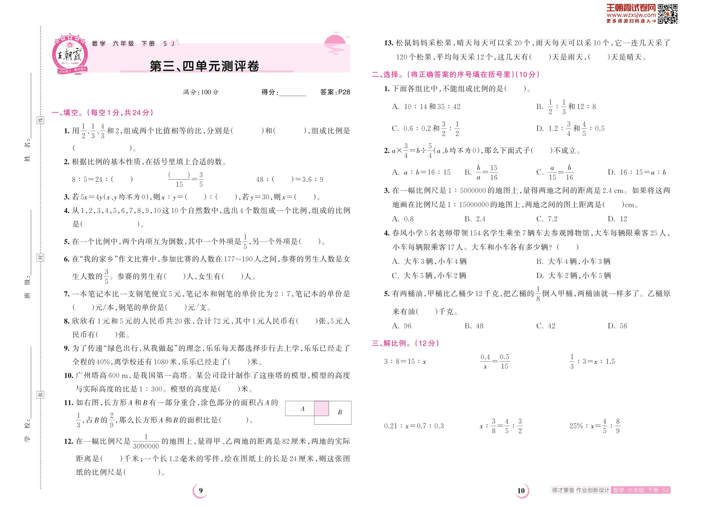 2023下册六年级数学苏教版 第三、四单元测评卷