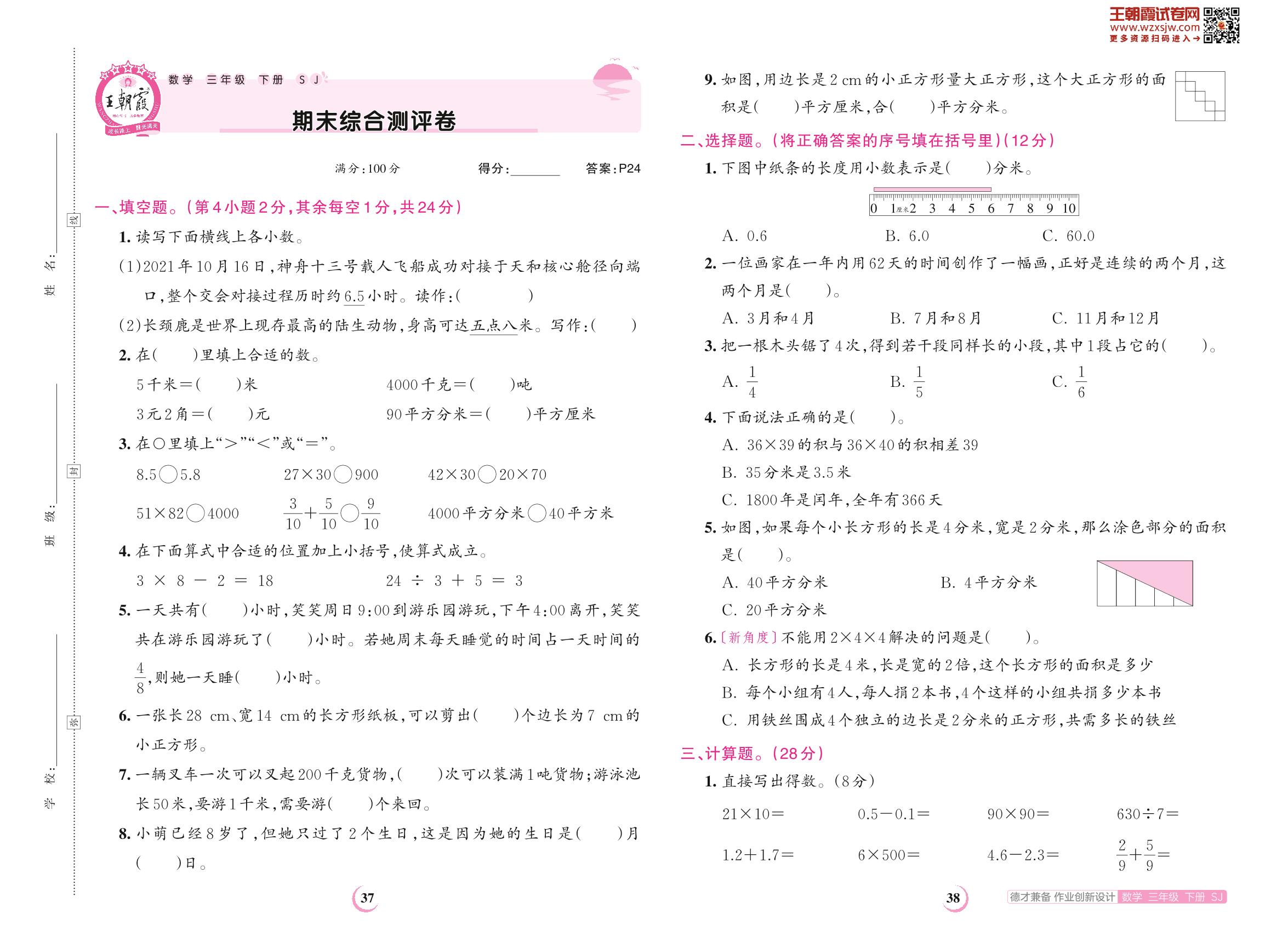 三年级数学苏教版下册期末卷