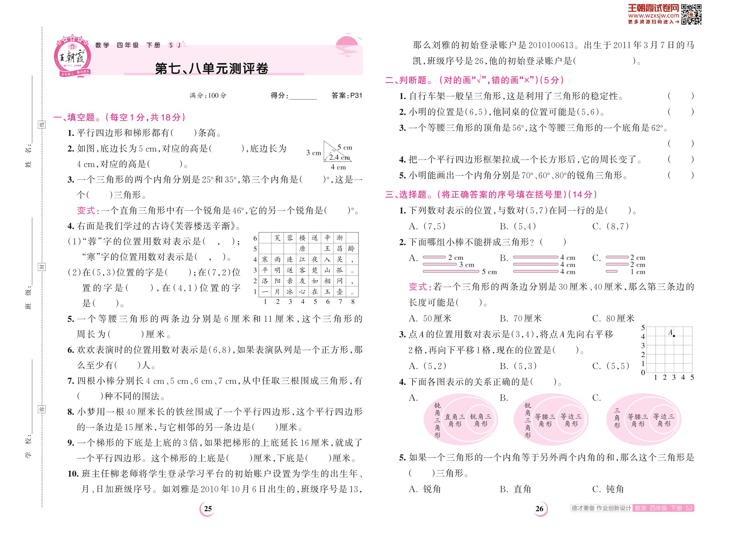 2023下册四年级数学苏教版 第七、八单元测评卷