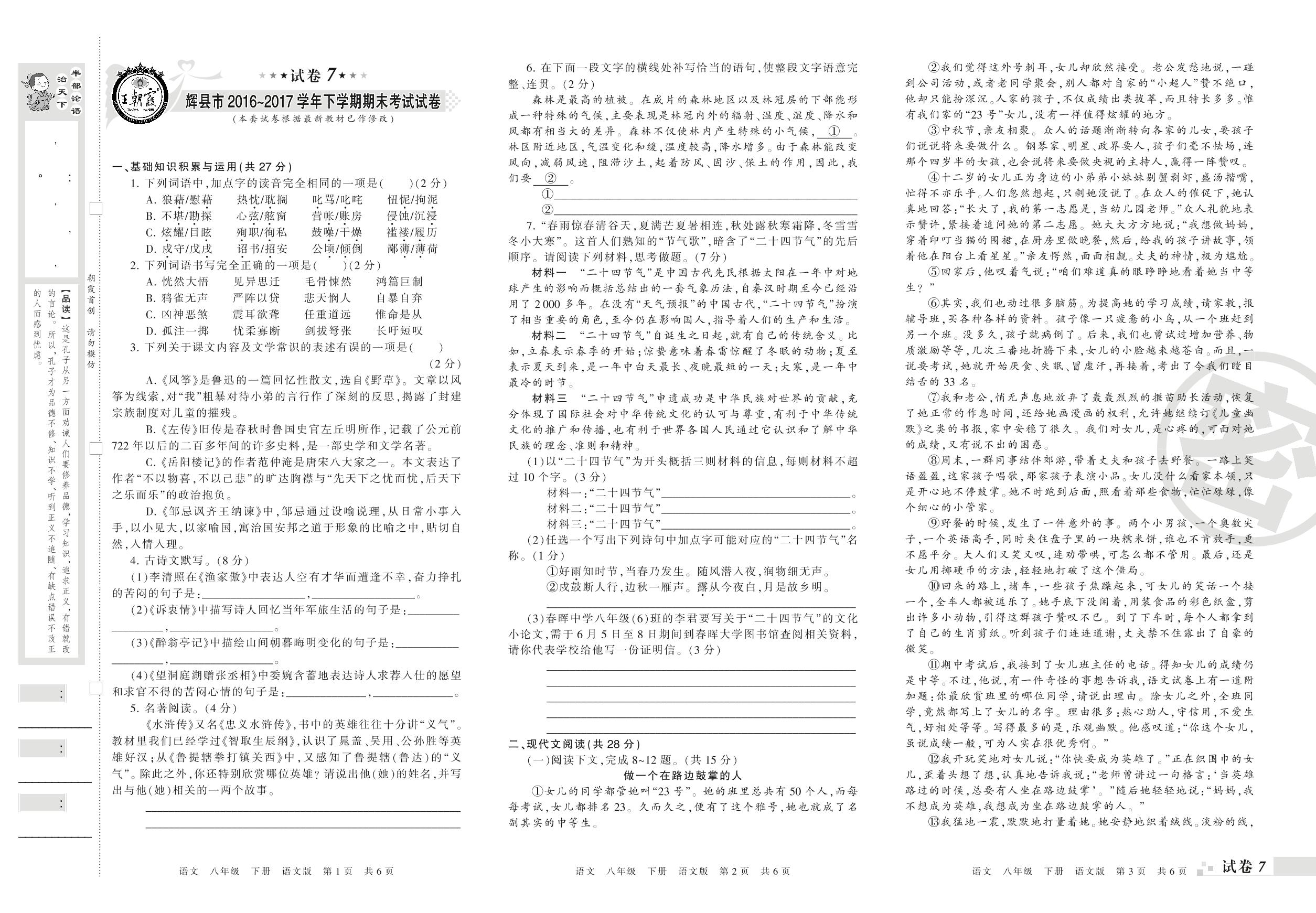 2016-2017学年第二学期辉县市八年级语文试卷(语文版)【7】