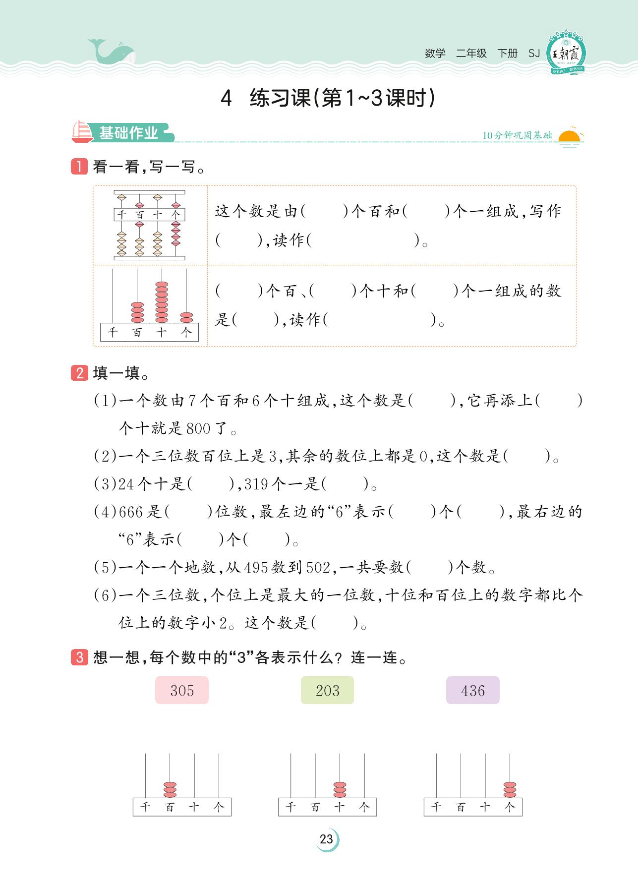 2023下册二年级数学苏教版 第四单元 认识万以内的数——4 练习课(第1~3课时)