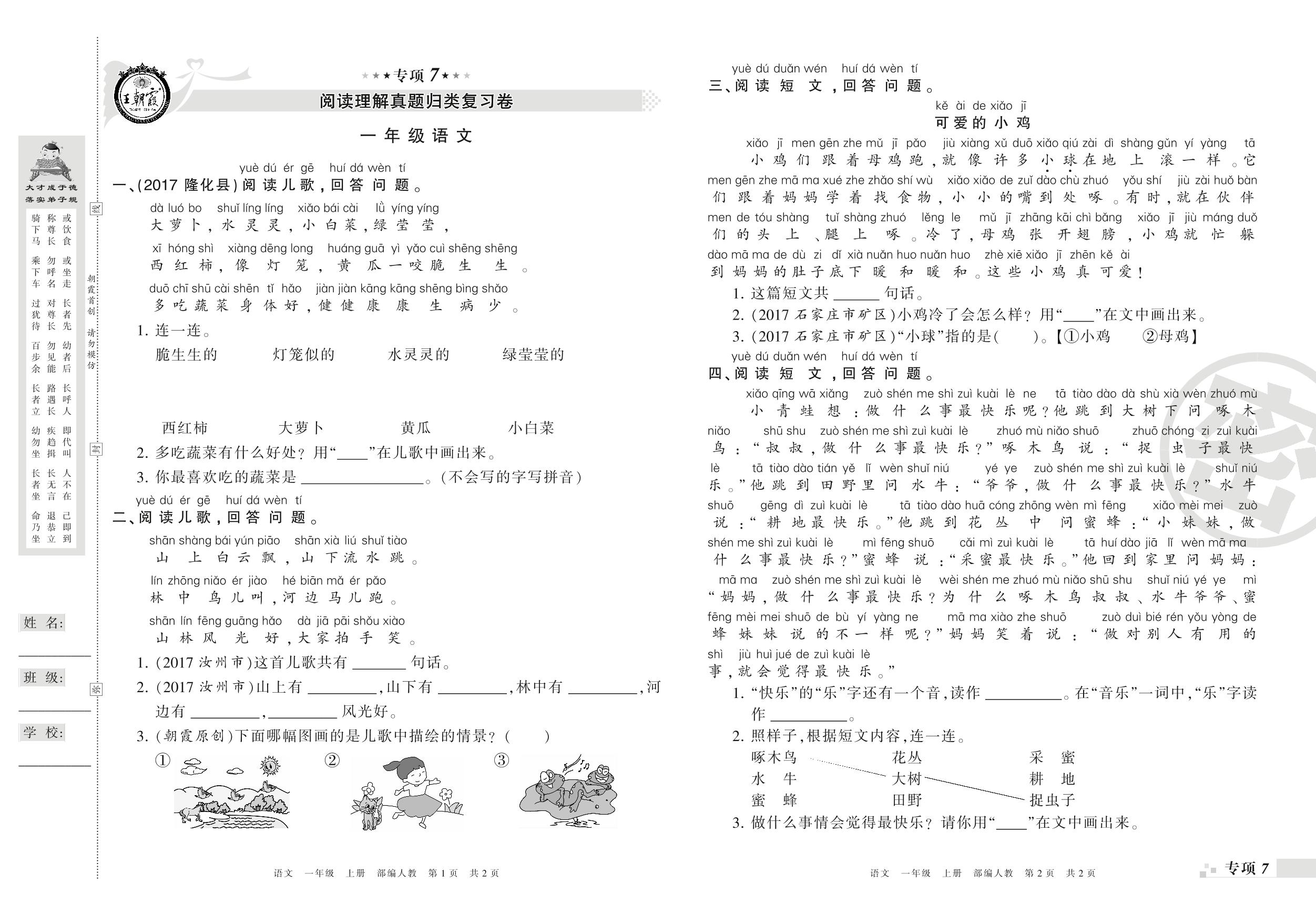 王朝霞期末专项卷——阅读理解、写话真题归类复习一年级上册语文(人教版)_R210731185703【0】