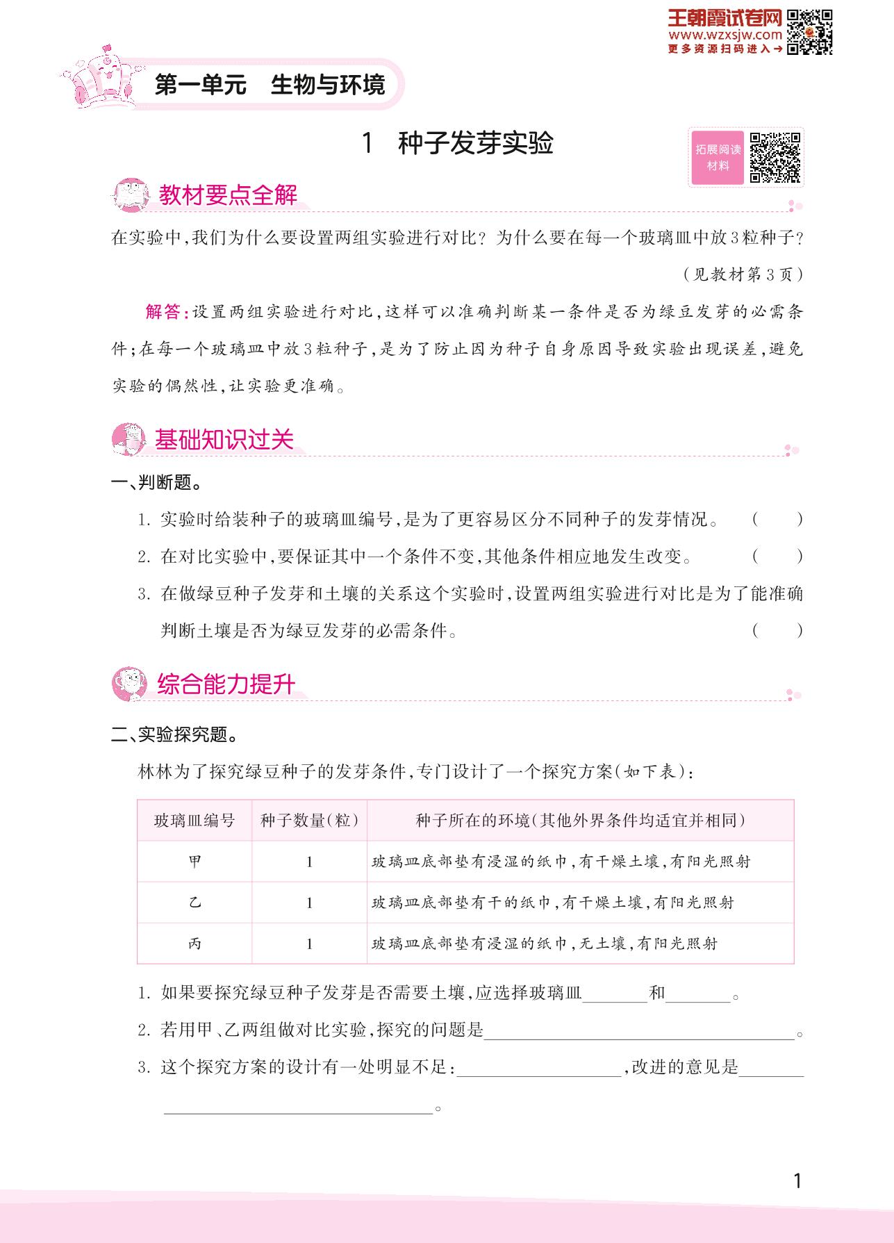 2023下册五年级科学教科版 第一单元 生物与环境——1 种子发芽实验