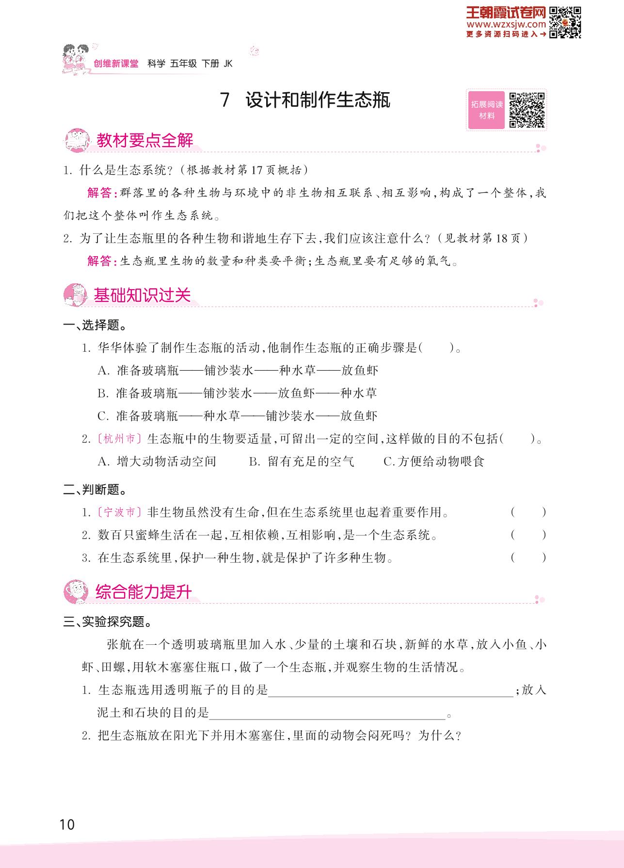 2023下册五年级科学教科版 第一单元 生物与环境——7 设计和制作生态瓶