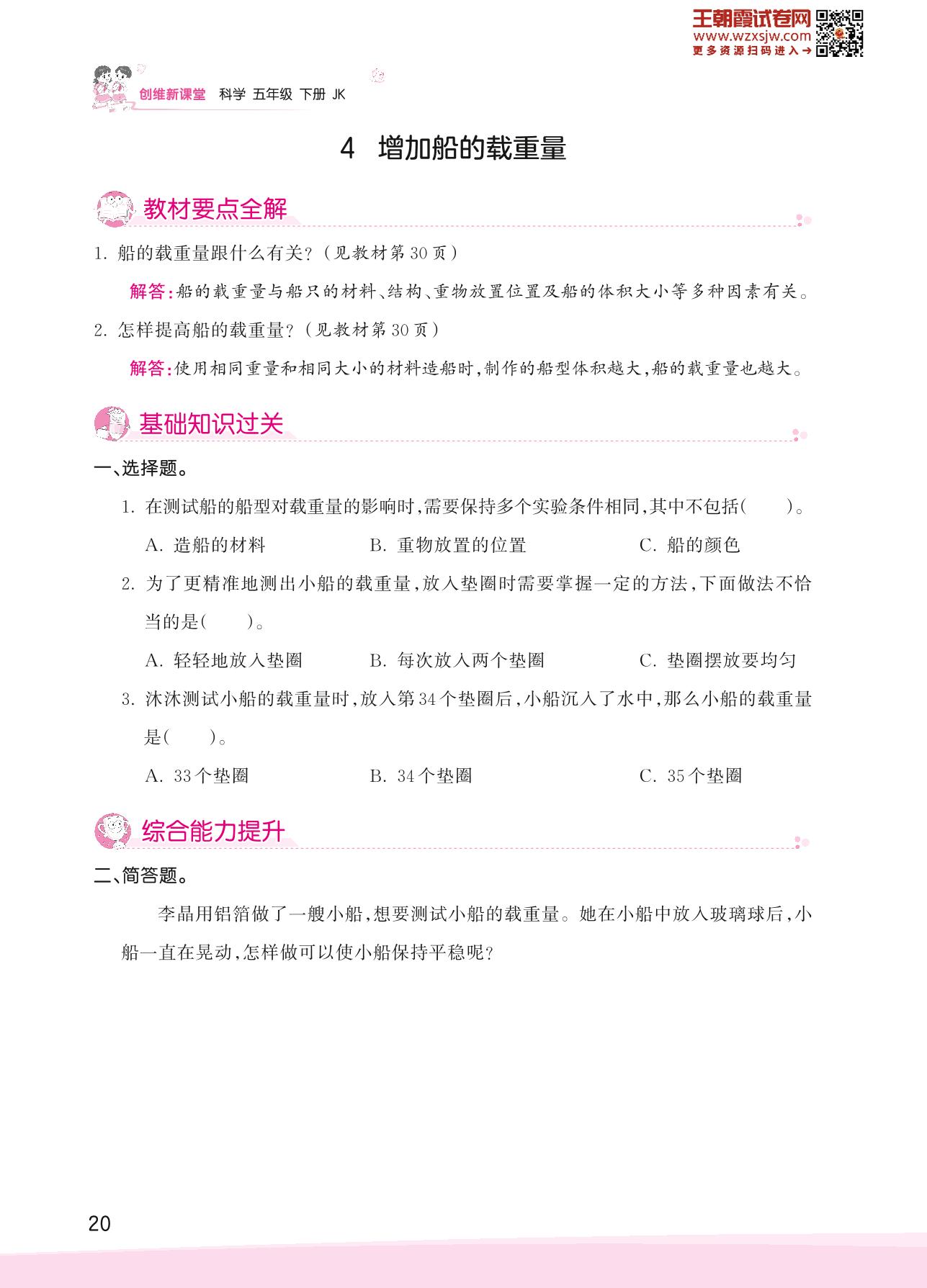 2023下册五年级科学教科版 第二单元 船的研究——4 增加船的载重量