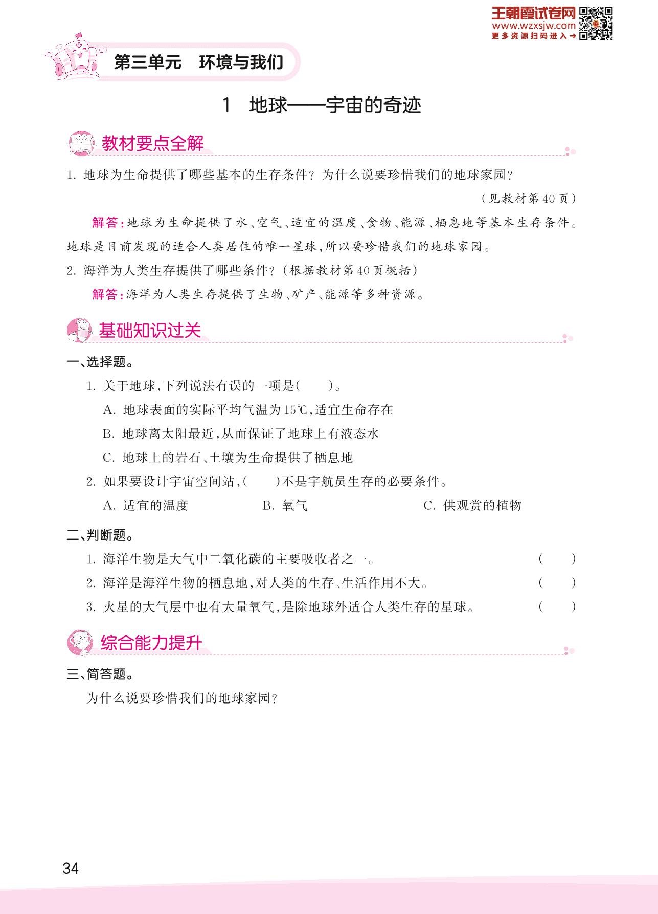 2023下册五年级科学教科版 第三单元 环境与我们——1 地球 宇宙的奇迹