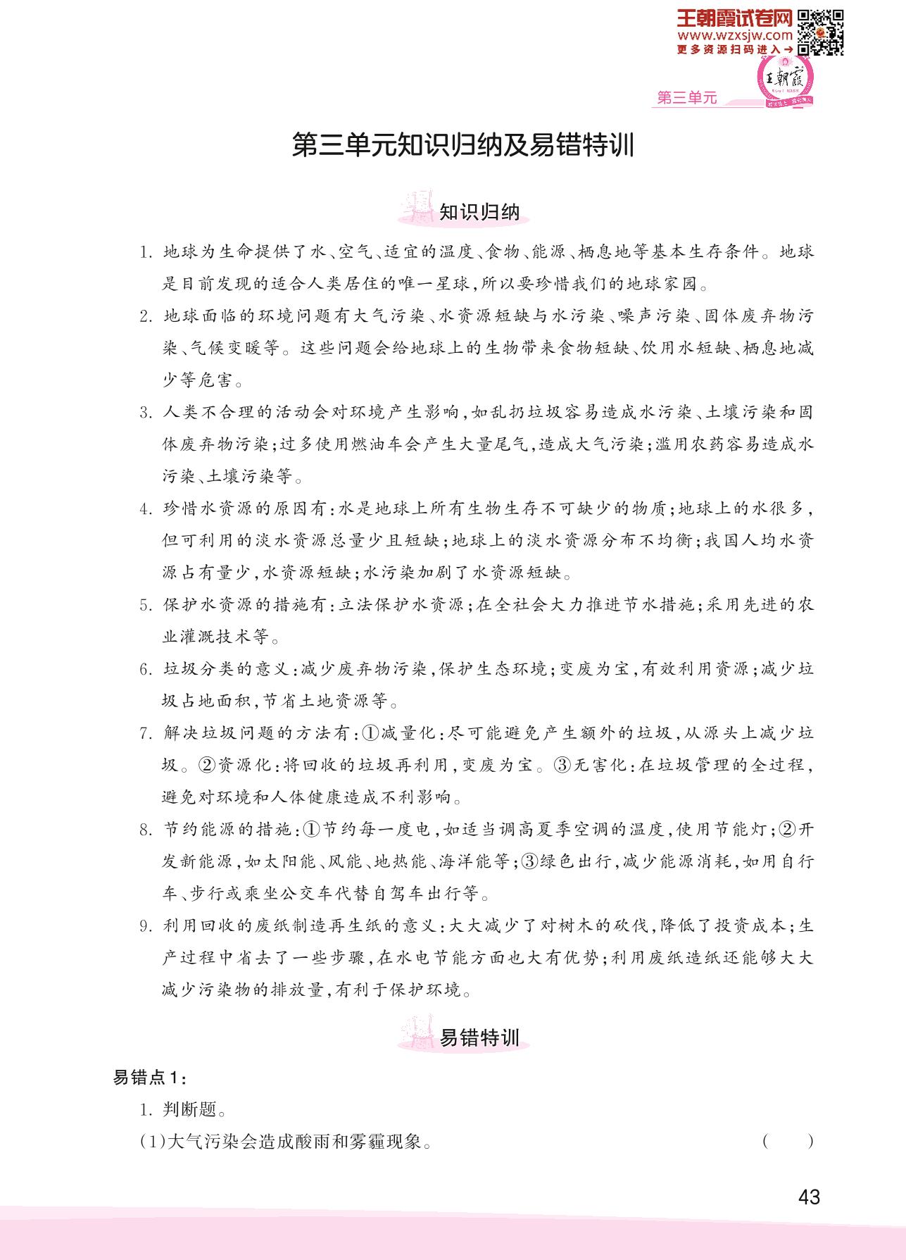 2023下册五年级科学教科版 第三单元知识归纳及易错特训