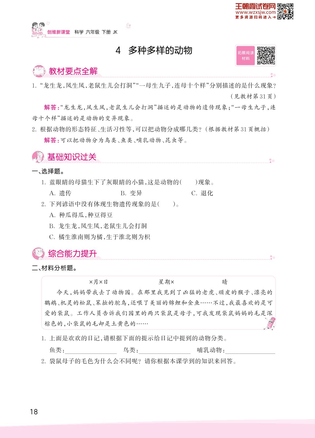 2023下册六年级科学教科版 第二单元 生物的多样性——4 多种多样的动物