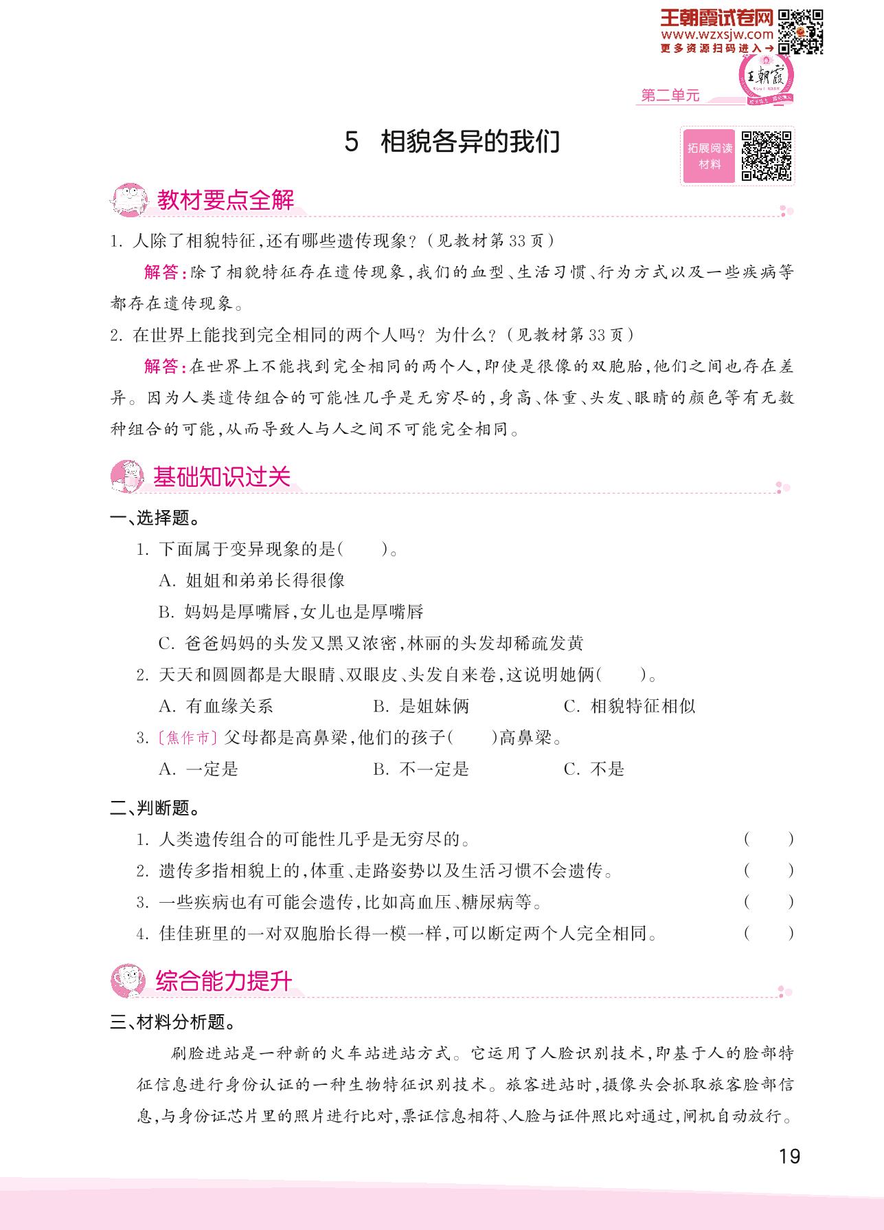 2023下册六年级科学教科版 第二单元 生物的多样性——5 相貌各异的我们