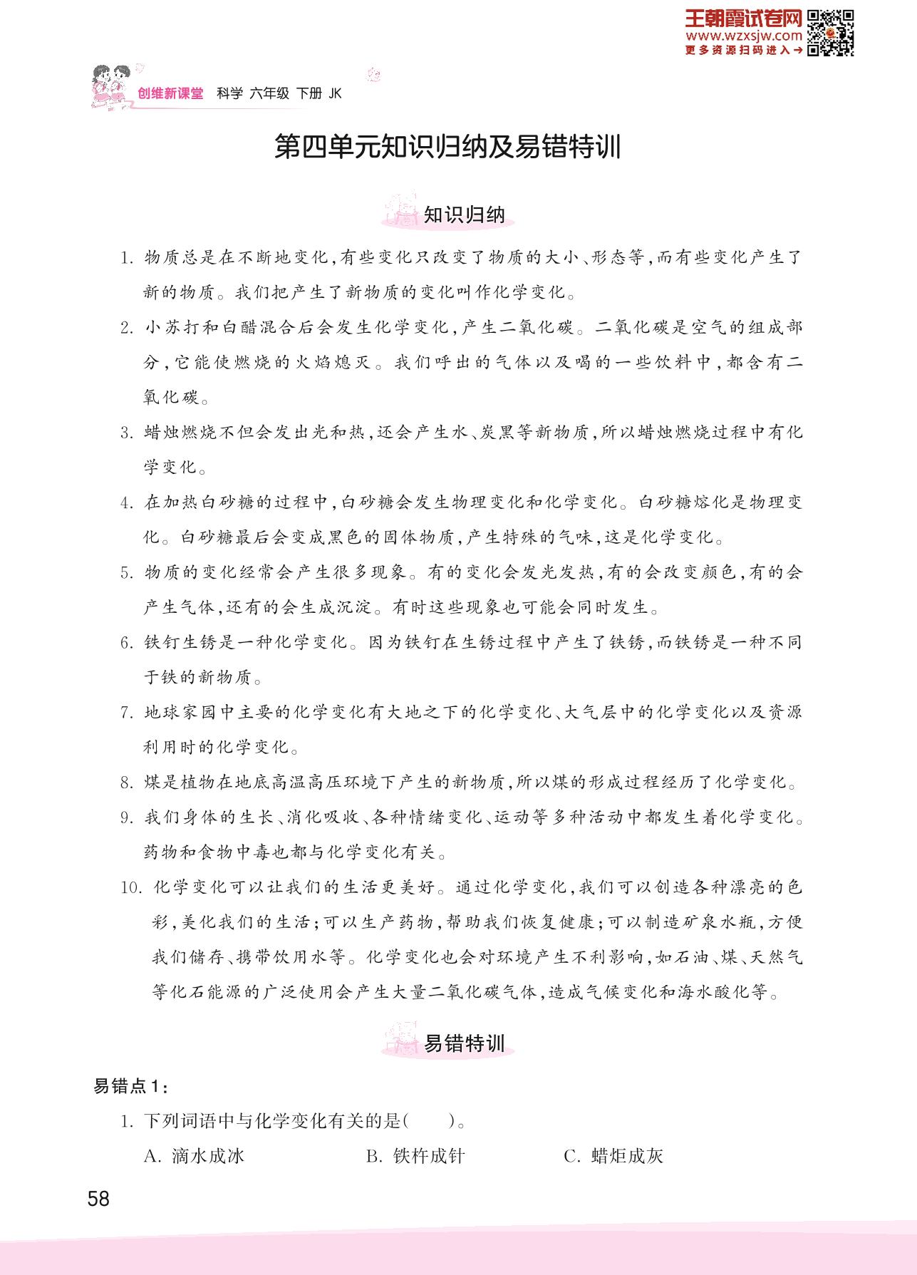 2023下册六年级科学教科版 第四单元知识归纳及易错特训