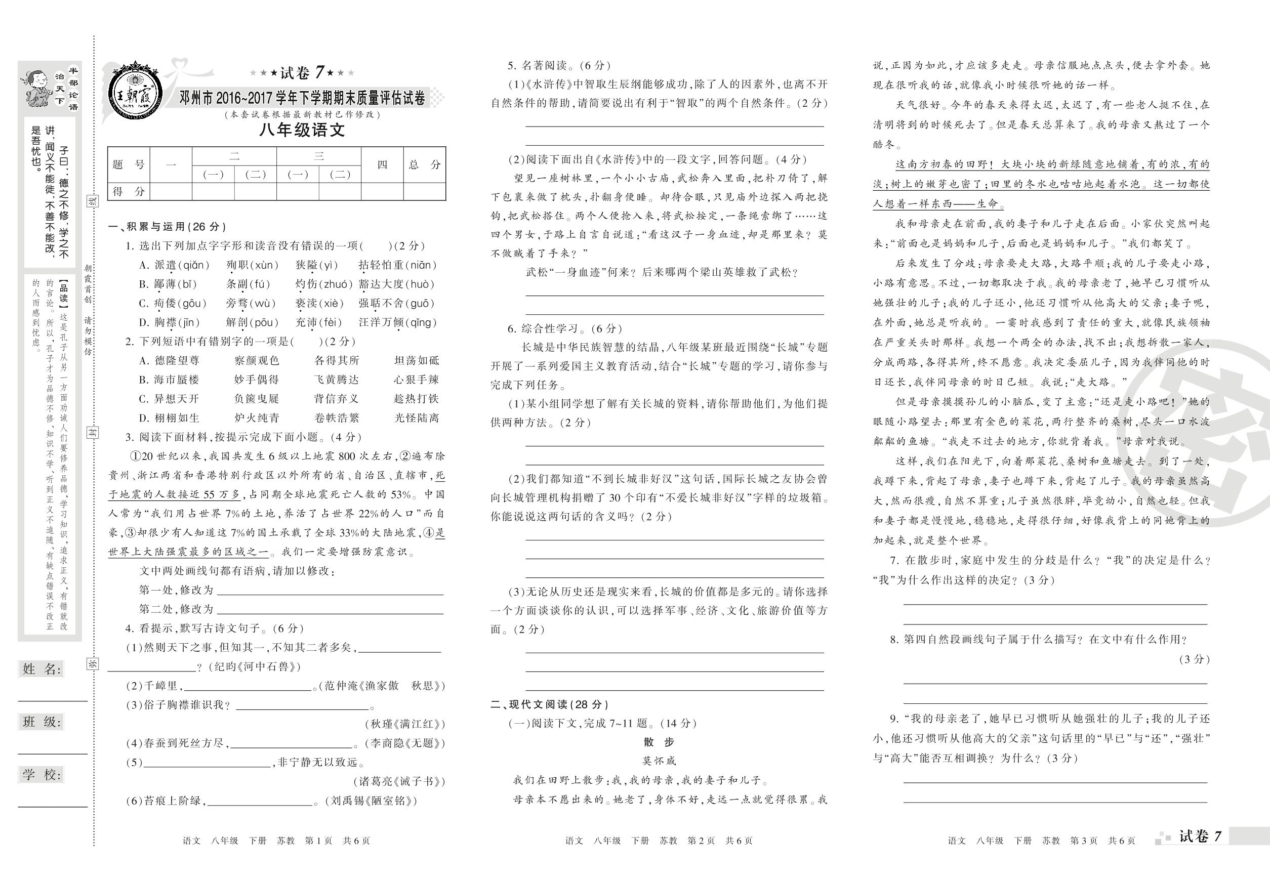 2016-2017学年第二学期邓州市八年级语文试卷(苏教版)【7】