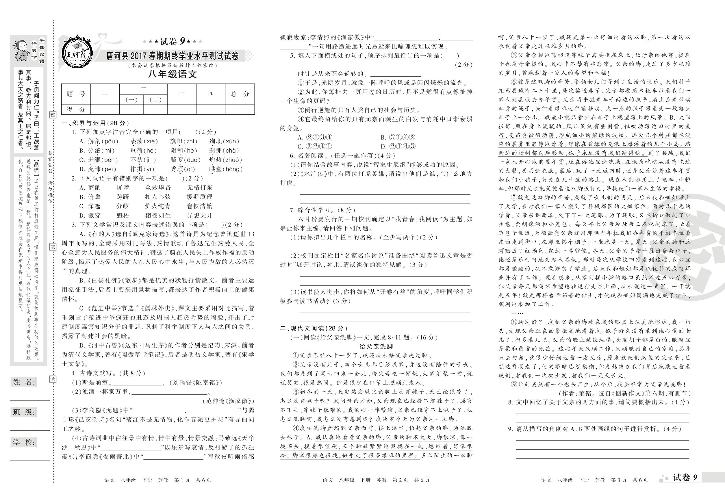 2016-2017学年第二学期南阳市唐河县八年级语文试卷(苏教版)【9】