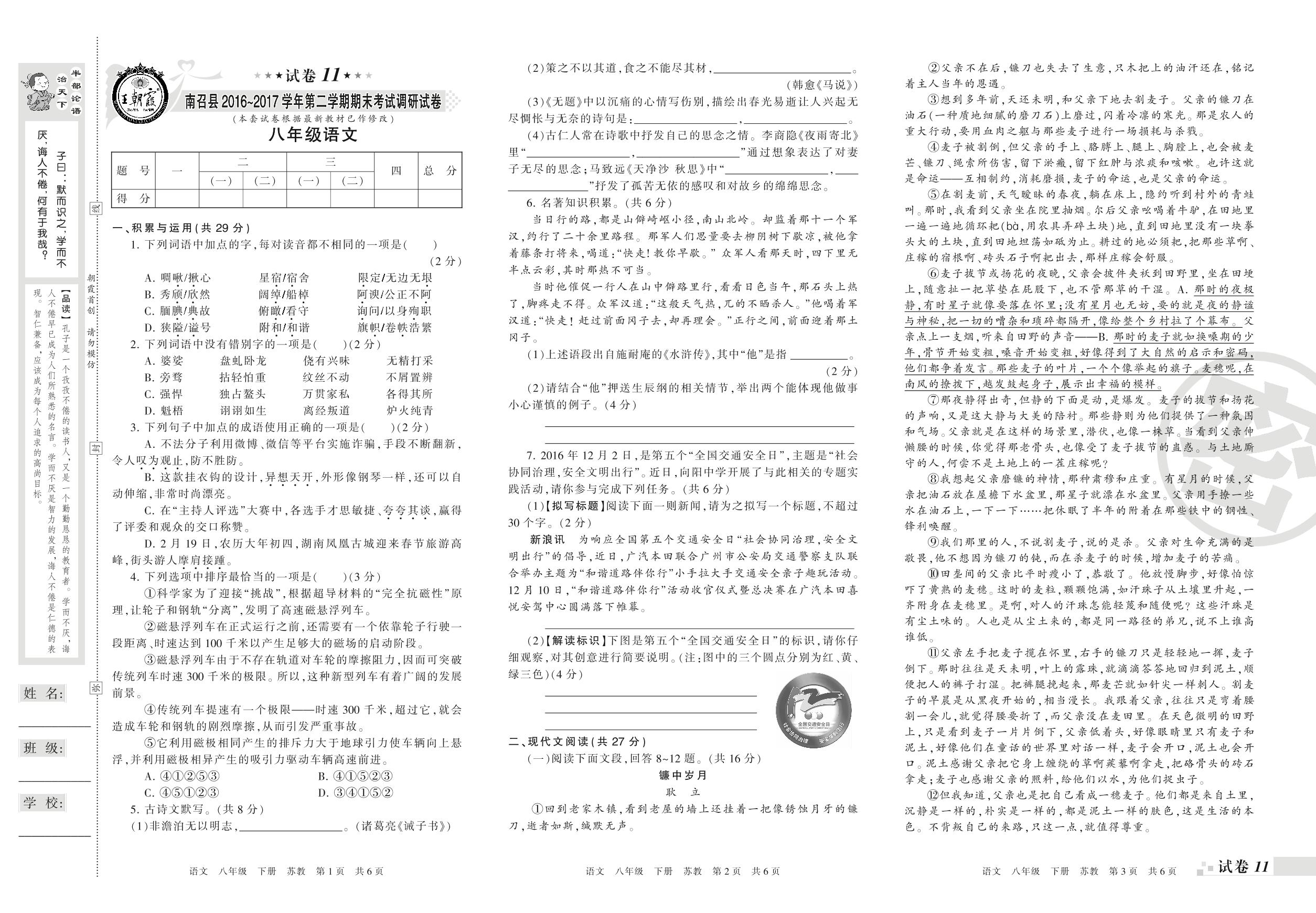 2016-2017学年第二学期南阳市南召县八年级语文试卷(苏教版)【11】
