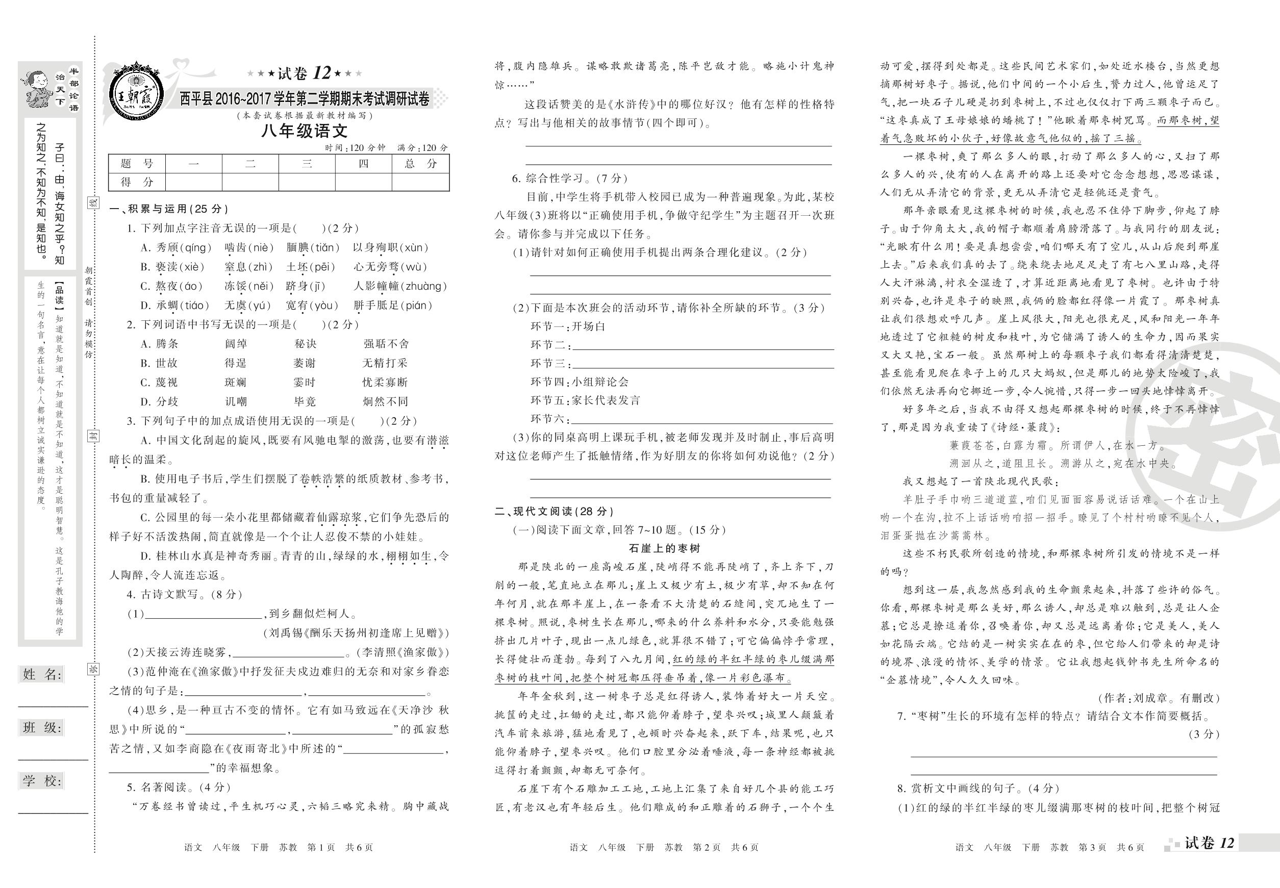 2016-2017学年第二学期驻马店市西平县八年级语文试卷(苏教版)【12】